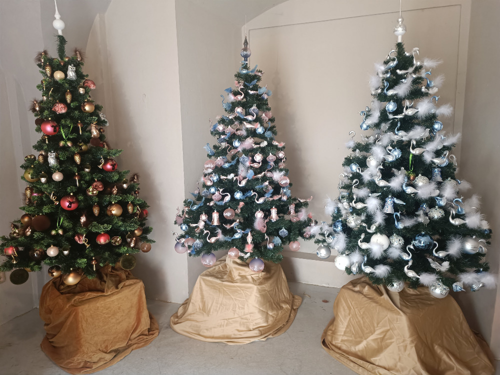 Zimou bílý stromeček je krásný, ale pro naše předky velká zima s nadílkou sněhu představovala problémy. Museli mít dostatek krmení pro domácí zvířata. Zajímavé je třeba, že za vlády Lucemburků bylo v Čechách tepleji, první studené léto bylo v roce narození Karle IV. roku 1316. Čokoládový stromeček má na vrcholu hvězdu Orion. Čokoládové bonbony nebo duté figurky, které se dají zavěšovat na stromeček jsou českým vynálezem. Říkalo se jim závěsky. Jejich výrobou proslul František Maršner, který měl od roku 1897 továrnu na pražských Vinohradech. Od roku 1914 firma označovala své výrobky modrou čtyřcípou hvězdou Orion dle ikonického návrhu grafika Zdenka Rykra, dvorního designéra firmy. Až do rohu 1952 v okolí továrny voněla čokoláda, pak byla výroba přesunuta do Modřan. Areál továrny byl zbourán v roce 2008, dnes jsou tam bytové domy. Zůstala značka Orion a její výrobky: tyčinky Kofila, rumové pralinky, kočičí jazýčky, ledové kaštany, ovšem nikoli v původní kvalitě. Prvorepublikový stromeček připomíná éru prezidenta Masaryka a pátečníků. V roce 1937 se mezinárodní situace velmi přiostřila a tak se na Vánoce 1937 sešli devadesátiletý vynálezce František Křižík a Karel Čapek před mikrofonem Československého rozhlasu a vyslali mírové poselství. František Křižík ho adresoval Albertu Einsteinovi a Karel Čapek indickému spisovateli a filozofovi Rabindranáthu Thákurovi, nositeli Nobelovy ceny. Oba adresáti odpověděli a podpořili úsilí o zachování míru. Karel Čapek psal Ježíškovi dopisy celý život. Vždy začal: „Pokoj lidem dobré vůle… a pak si něco přál.“ Tradice Vánočního stromu republiky začala v roce 1924 v Brně díky spisovateli Rudolfu Těsnohlídkovi, který se inspiroval dánskou tradicí. Podnětem k založení akce byla událost z roku 1919, kdy Těsnohlídek našel v bílovickém lese opuštěnou sedmnáctiměsíční holčičku. Hlavním cílem bylo uspořádat charitativní sbírku na pomoc potřebným dětem pod veřejným vánočním stromem. První vánoční strom zasvítil 14. prosince 1924 na náměstí Svobody v Brně, z výtěžku sbírky byl vybudován Dětský domov Dagmar. Jméno dostal po dánské královně Dagmar, dceři krále Přemysla Otakara I. Domov byl otevřen v roce 1929 a slouží dodnes. Tato tradice se postupně rozšířila i do dalších českých měst. Opouštíme prvorepublikový stromeček, procházíme kolem Jedlého a už je tu Mašinkový. Českým unikátem je stavebnice Merkur. V roce 1920 založil Jaroslav Vancl v Polici nad Metují firmu Inventor. Zpočátku se díly spojovaly pomocí háčků, ale po pěti letech přešel Vancl na systém šroubků a matiček a zaregistroval ochrannou známku Merkur. Za druhé světové války byla výroba přerušena, po roce 1948 byla firma znárodněna. Po sametové revoluci obnovil výrobu Jaromír Kříž. Protektorátní stromeček evokuje smutnou dobu, kdy byl přídělový systém na lístky. Navíc se dalo získat jídlo jen na vesnici i když za nepovolenou zabíjačku hrozil trest smrti. Andělský stromeček sousedí s Čertovským. Čerti jsou původně andělé. Lucifer nechtěl uctívat a poslouchat Boha. Bůh ho proto s ostatními padlými anděly svrhnul do pekla. Adventní kalendář Domovina 2025 to je dárkový box s 24 samostatně balenými ozdobami. „Letošní kolekce Domovina může být pro mnohé inspirací i poučením, protože jsme vytvořili také 24ks dárkový box jako Adventní kalendář „Z domoviny“. Každý den adventu tak můžete postupně objevovat kousek domova a vánoční atmosféry od malovaných kouliček po olivy. Na Štědrý den na vás čeká poslední ozdoba. Formát adventního kalendáře jsme poprvé uvedli v roce 2023 a dnes již nabízíme několik variant i obsah na zakázku. Domovina je naší letošní novinkou. Připravte se na nezapomenutelné Vánoce. Adventní kalendář Domovina ukrývá 24 originálních ručně foukaných ozdob s folklorními dekory inspirovanými 30. léty 20. století. Každá ozdoba je pečlivě zabalená v samostatné krabičce a uložena v elegantním papírovém boxu – ideální jako jedinečný dárek kdykoli během roku, který přináší radost po celý advent,“ říká Kateřina Šrámková. Do doby socialismu nás zavádí Socialistický stromeček, Další Boží nebo zboží je ověšen krabicemi. V roce 1952 byla snaha nahradit Ježíška Dědou Mrázem, snažil se o to prezident Antonín Zápotocký ve svém vánočním projevu. Blíží se konec prohlídky, ještě tu je stromeček Zvonečkový, Buď práci čest, Čarostřelec, Červánkový a Svatební. Vrcholem a krásným zakončením jsou 3 stromečky inspirované vánoční televizní pohádkou „Tři oříšky pro Popelku“. Československo-německá filmová pohádka z roku 1973 režiséra Václava Vorlíčka podle předlohy Boženy Němcové nesmí o Vánocích chybět. Stromečky mají ozdoby podle šatů, které Popelka našla v oříšcích. Čarostřelec, kdy střílí v lese lépe než princ, pak šaty, které měla na plese a konečně šaty svatební.