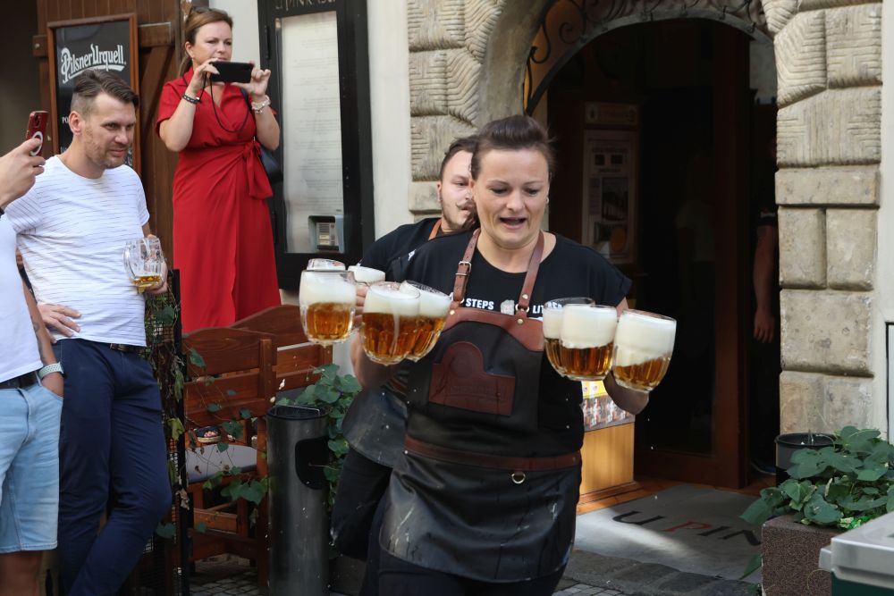 ze sklepa. Letos nás však mile překvapilo rekordní zapojení žen do této prestižní události, kdy čtyři odvážných žen se rozhodlo přijmout výzvu běhu výčepních,“ vysvětluje smysl závodu Karel Doubek, ředitel společnosti Adria – Neptun provozující restauraci U Pinkasů.