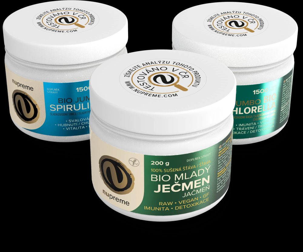Někdy je ale obtížné ve stravě zkonzumovat optimální množství těchto darů přírody. A tak můžeme tělu některé živiny dodat také prostřednictvím doplňků stravy. Chlorella, spirulina a mladý ječmen se řadí mezi superpotraviny a někdy se jim říká také supergreens a najdeme je také v nabídce Nupreme.