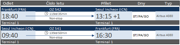 Frankfurt nad Mohanem, 9. května 2023 – Od 12. července bude Airbus 380 společnosti Asiana Airlines opět létat mezi Soulem a Frankfurtem nad Mohanem. Letadlo bude spojovat Frankfurt s korejskou metropolí třikrát týdně, přičemž se bude střídat s A-350 na každodenním non-stop letu. Největší pravidelné letadlo na světě, které mezi Frankfurtem a Soulem letělo poprvé roku 2019, bude operovat s kapacitou 495 míst ve tři pracovní dny ve středu, pátek a neděli mezi Frankfurtem a Soulem, aby uspokojilo zvýšenou poptávku v letních měsících. Lety A380 jsou plánovány zatím do 6. srpna.
