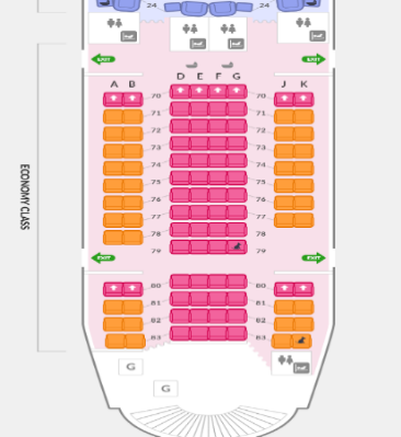 Ekonomická třída se v Airbusu A-380 je k dispozici na dolní palubě a rovněž v zadní části horní paluby (jak je znázorněno na obrázku). Sedadla v ekonomické třídě na horní palubě jsou uspořádána v konfiguraci 2-4-2 a jsou považována za mimořádně oblíbená. Všechna sedadla v ekonomické třídě mají nadprůměrnou rozteč 87 cm a tím poskytují nadprůměrný prostor pro nohy. Horní paluba a hlavní paluba jsou propojeny několika schodišti.