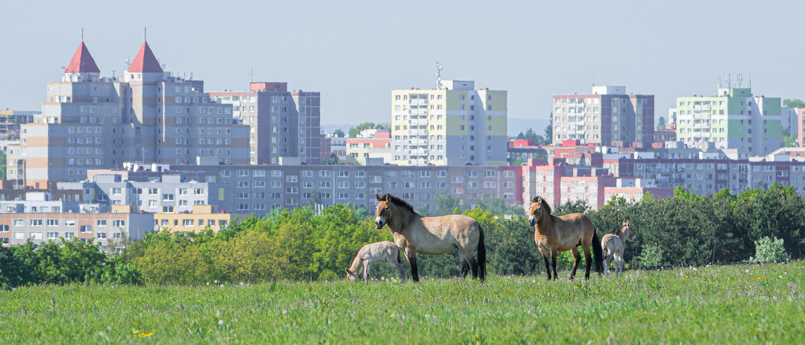 Foto 2: Pražské Dívčí hrady nabízejí nyní unikátní pohledy na divoké koně Převalského s hříbaty a městské panorama. Nalevo stojí klisna Vereda se svým hříbětem, napravo klisna Gruhne s tím svým. Foto Petr Hamerník, Zoo Praha