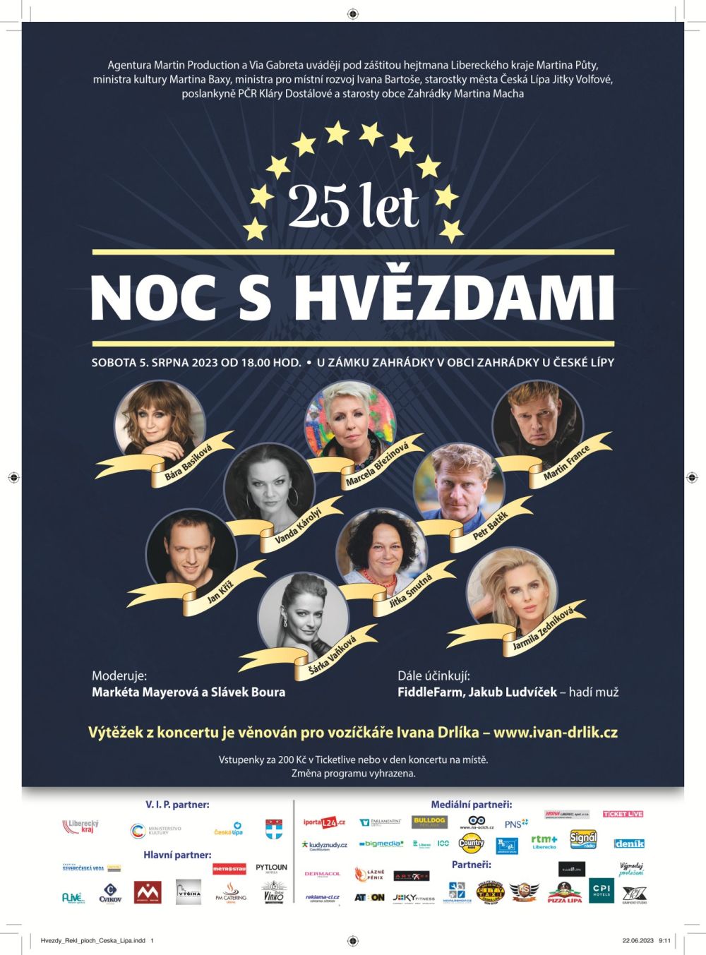 Letos se první sobotu v srpnu potkají známé osobnosti na zámku Zahrádky u České Lípy již po pětadvacáté a to na benefičním koncertu „Noc s hvězdami“. Koncert před dvaceti pěti lety začínal na hradě Houska a po šestnácti letech se přesunul na vyhořelý zámek na Zahrádecko. Letos je poprvé výtěžek věnován konkrétní osobě a to invalidnímu vozíčkáři Ivanu Drlíkovi z libereckého kraje – www.ivan-drlik.cz . Toho bohužel před více jak 20 lety srazilo auto, které z místa činu ujelo a pachatel je dodnes neznámý. Sám vozíčkář Drlík však na tento incident nerad vzpomíná, ale osobně se akce zúčastní a převezme šek od organizátorů. On sám je však plný života a rád by se alespoň částečně vrátil do klasického života. Doma si v upraveném bytě pro invalidní vozík pěstuje na balkóně ovoce a zeleninu a vaří si z toho třeba džemy nebo zeleninové chutney. Také občas zajde do rukodílných dílen, kde vytváří třeba keramické květináče nebo různé ozdoby do bytů a do zahrad.
