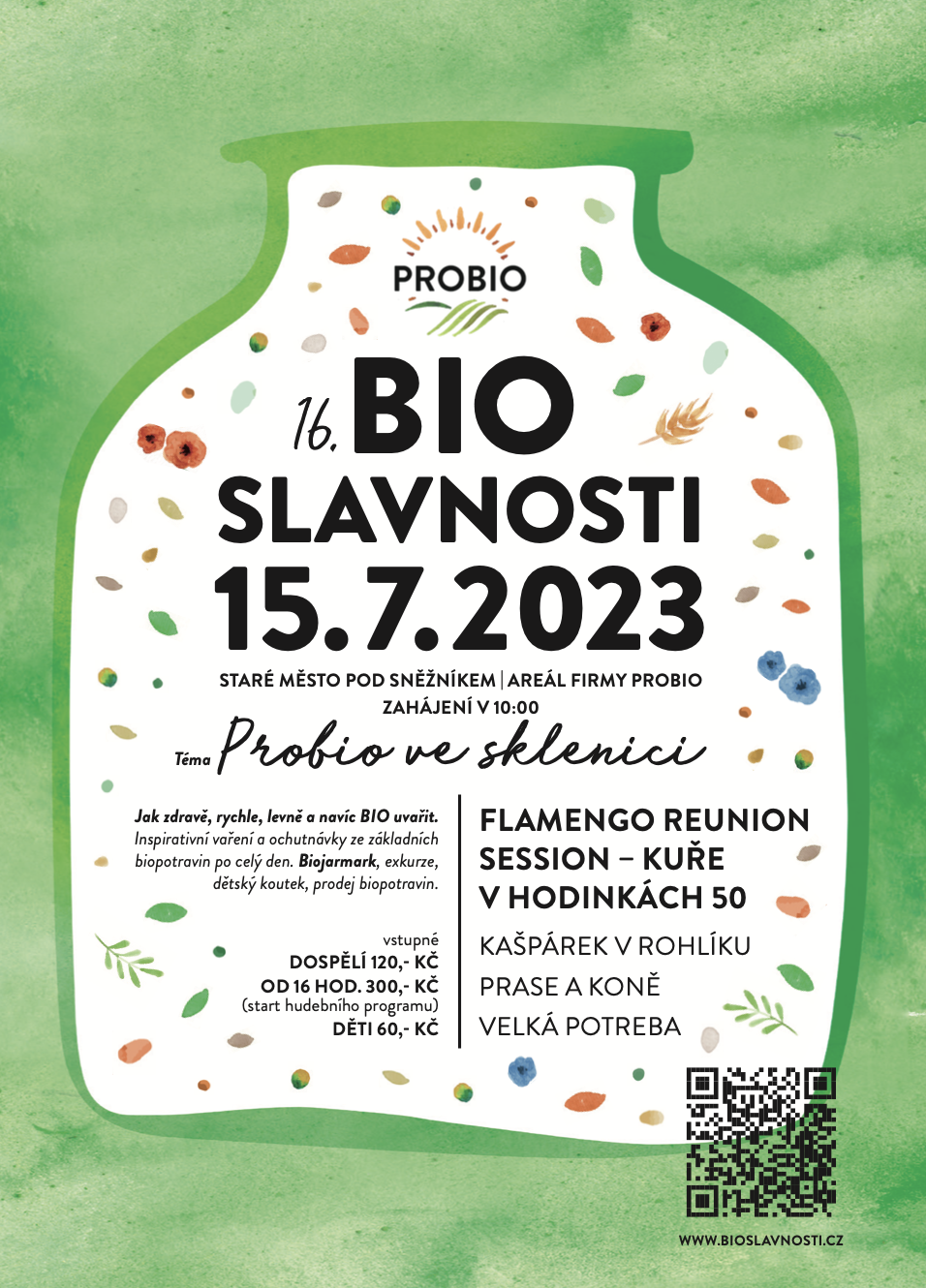 Srdečně vás zveme na 16. ročník Bioslavností, tradiční festival dobrého jídla, pití a zábavy pro celou rodinu, který se bude konat v sobotu 15. července 2023 od 10 hodin v lesoparku v areálu společnosti Probio ve Starém Městě pod Sněžníkem.