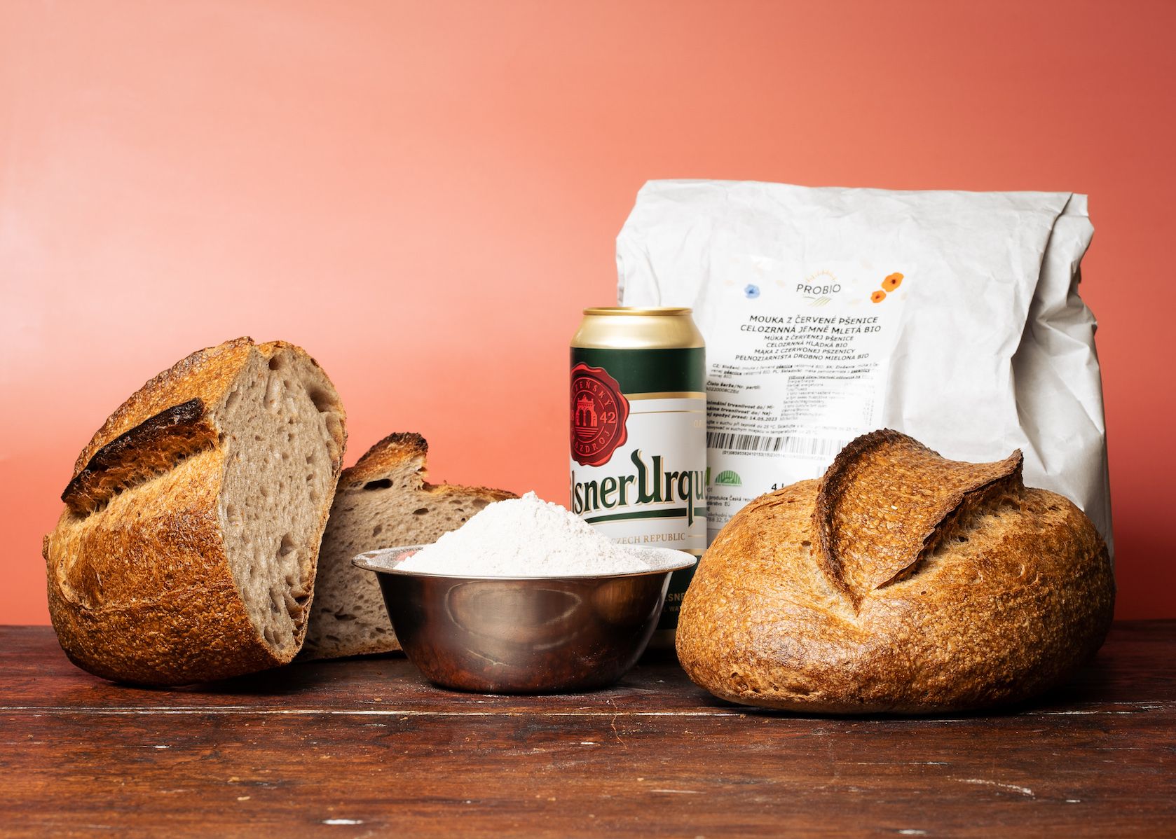 Řemeslný chléb Červené zrno se vyrábí z pšeničného kvasu metodou pomalé fermentace, kdy kyne 18 hodin v 6 stupních Celsia. Osahuje plzeňské pivo (přesněji pivní redukci z něj) a 15 % mouky z červené pšenice. Ta dává chlebu tmavší zabarvení, lehkou oříškovou příchuť a také cenné zdravotní benefity – obsahuje flavonoidy katechin, tannin a také antokyan – přírodní barvivo, které je zároveň antioxidantem. Přestože červená pšenice patří mezi původní druhy obilovin, u nás je používána spíše vzácně.