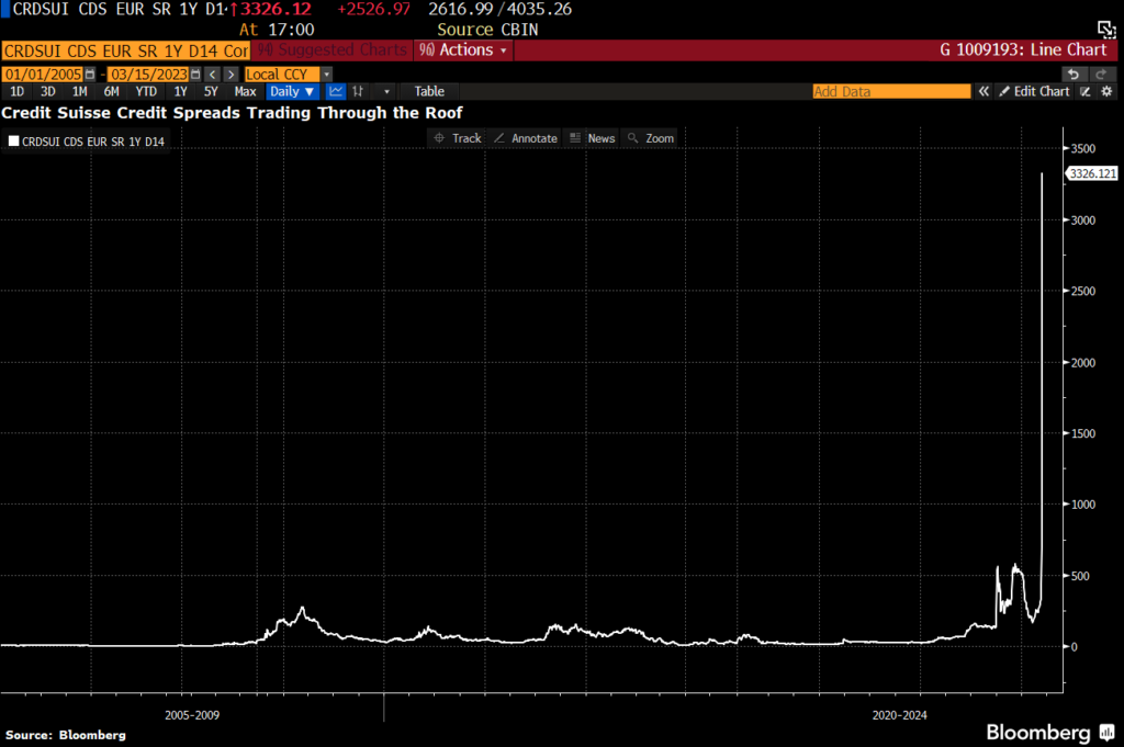 Pojištění proti krachu Credit Suisse dnes odpoledne zdražilo na krizové úrovně. Odpovídá ceně pojištění třeba americké banky Morgan Stanley v září 2008, po krachu Lehman Brothers. Tímto krachem tehdy odstartovala nejkritičtější fáze světové finanční krize let 2008 a 2009. Cenu pojištění proti pádu Credit Suisse nyní zhusta vyhánějí banky, které s ní uskutečňovaly obchody a transakce, a nyní si ve strachu a shonu pojištění kupují (viz graf níže).