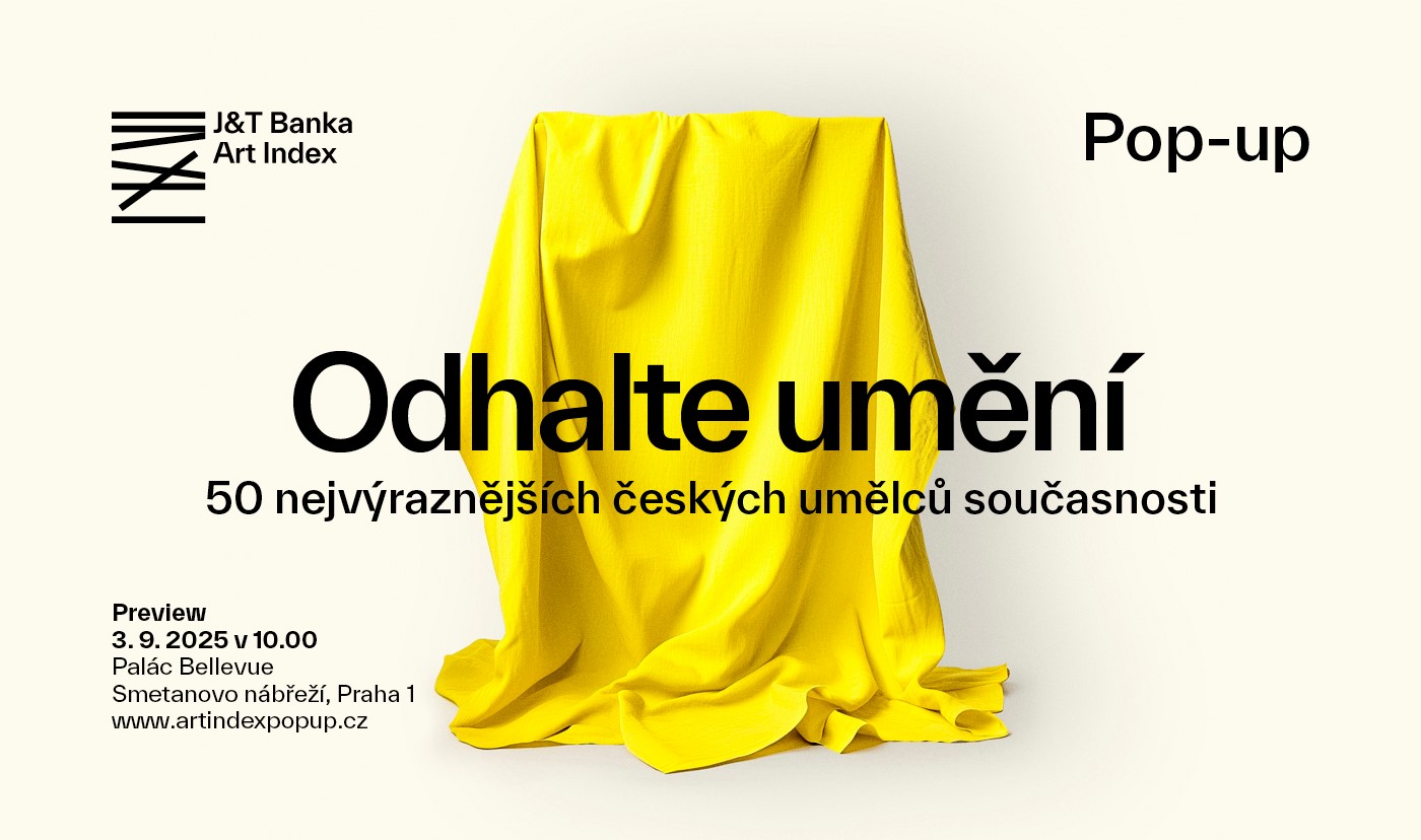 Nejnovější tvorbu z ateliérů současných umělců poodkryje J&T Banka Art Index Pop-up od 4. do 7. září 2025. Výběr z díla padesáti tvůrců zastoupených na J&T Banka Art Indexu je přístupný zdarma všem, kdo v Paláci Bellevue u Karlova mostu chtějí snadno získat přehled o současném tuzemském umění, z nichž mnohé má renomé i v zahraničí. A možná si některé dílo i odnést. Více informací na: artindexpopup.cz