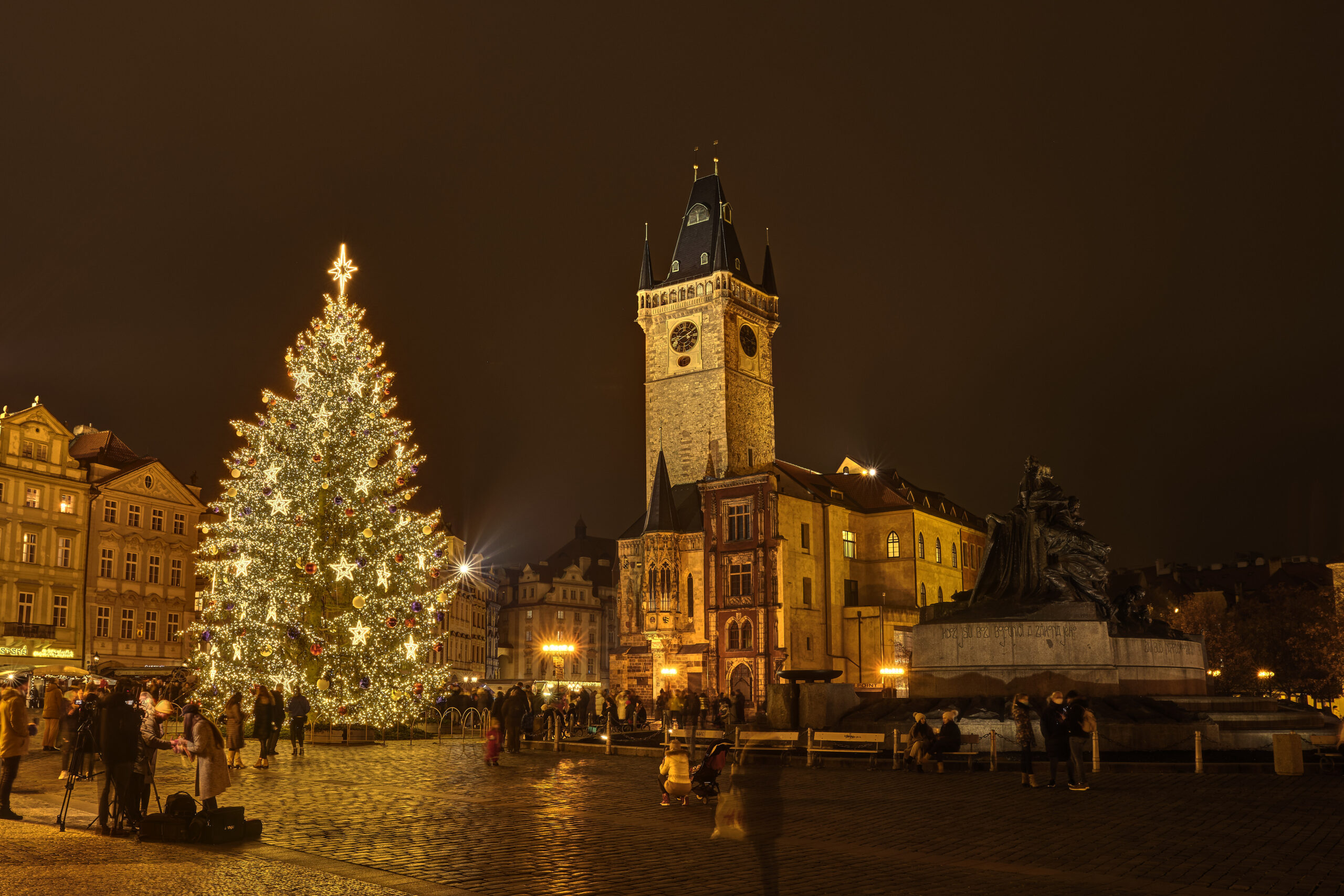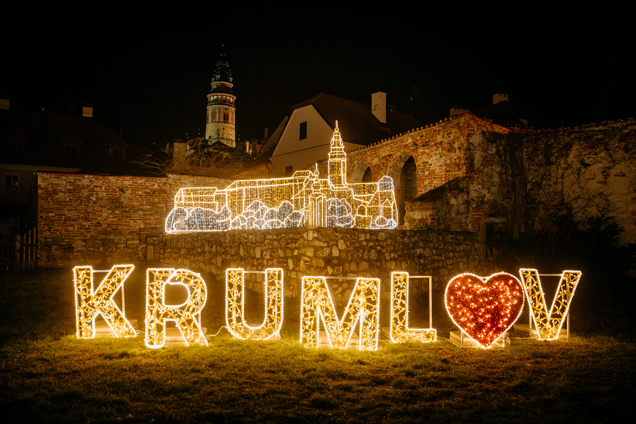 Vánoční výzdoba Staroměstského náměstí v Praze s dominantním stromem v tradičních barvách. Vpravo nasvícený historický Český Krumlov.