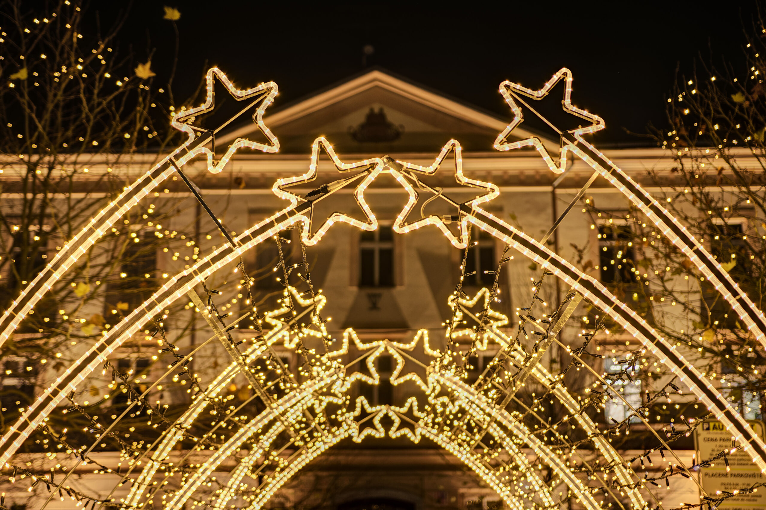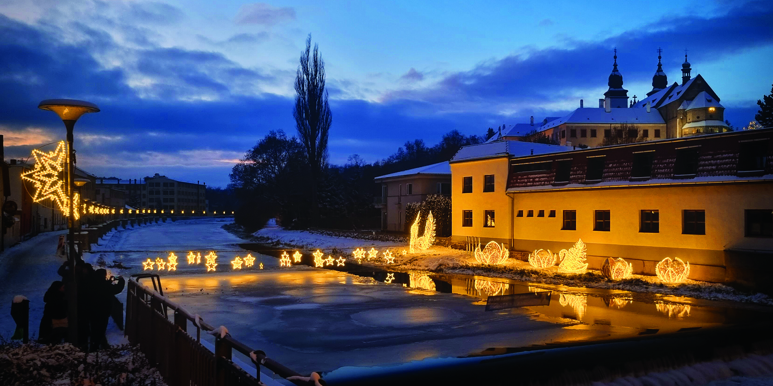 Světelné instalace DECOLED citlivě podtrhují atmosféru míst a nechávají naplno zazářit jejich jedinečnost. Zleva vánoční výzdoba ve Stříbře, vpravo osvětlená Třebíč.