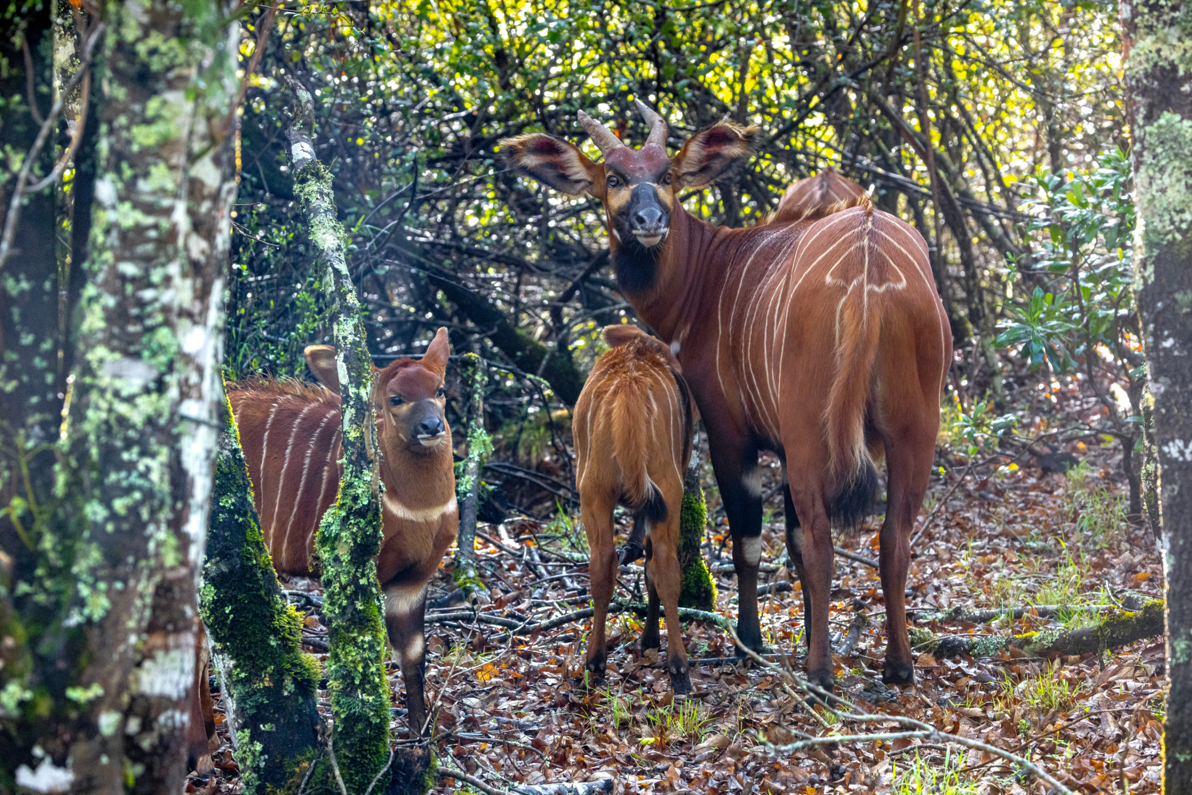 Foto 1: Bongové horští na snímku pořízeném v chovné a záchranné stanici Mount Kenya Wildlife Conservancy. Zoo Praha jejím prostřednictvím podporuje program na reintrodukci bongů do volné přírody, konkrétně financováním výsadby lesního porostu, na který je tento druh striktně vázaný. Foto Miroslav Bobek, Zoo Praha