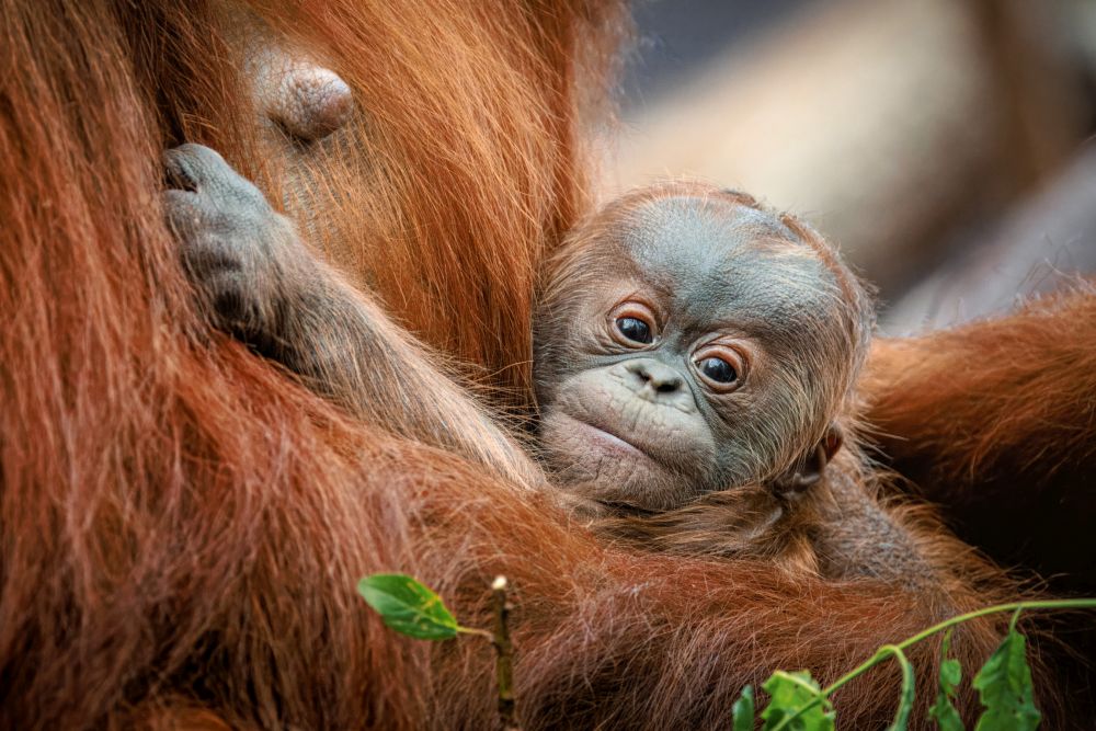 Foto 1: Mládě orangutana sumaterského dostane jméno v den svých měsíčních narozenin, v neděli 2. června v 11 hodin. Jde o prvního potomka samice Diri, která se o malého samečka stará velmi pečlivě. Foto Miroslav Bobek, Zoo Praha