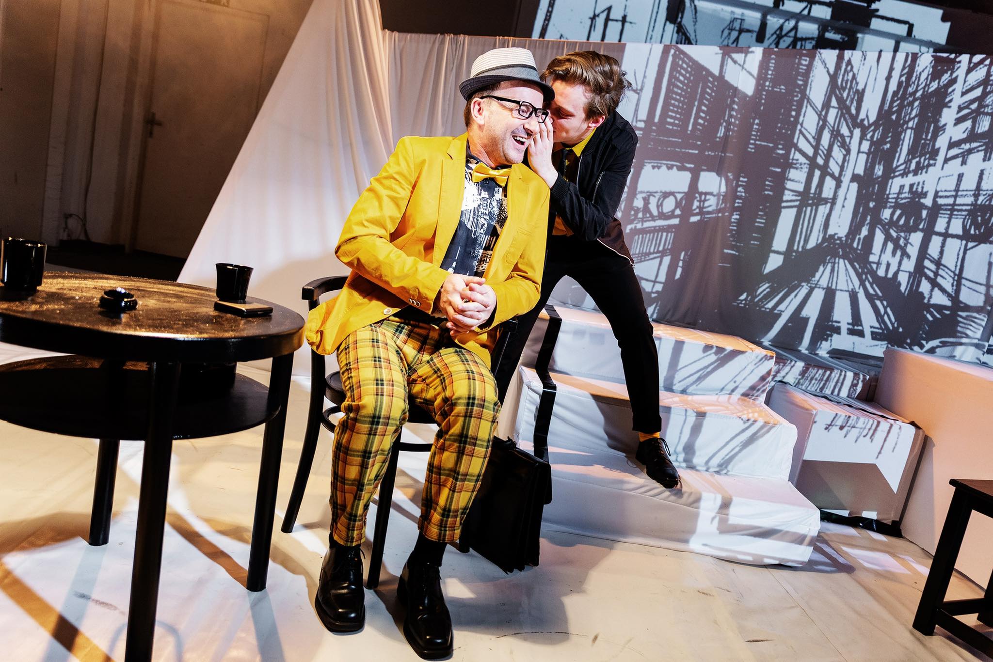 Jakub Jelínek v titulní roli exceluje. Absolvent DAMU (alternativní a loutkové divadlo) hraje v D21 v několika inscenacích. Současně působí také v divadle Pomezí, Chemickém divadle a loutkoherecké divadelní skupině Fras. Hrál v celé řadě TV seriálů (např. V dceři národa či ve Stínech v mlze a také v několika filmech.