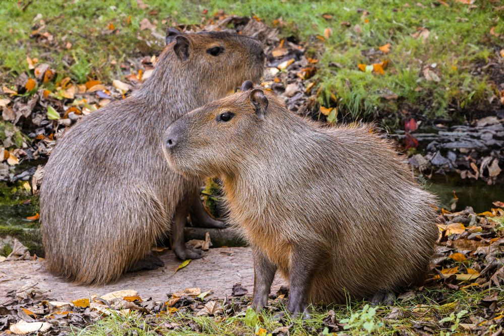 Foto 1: Pár mladých kapybar mohou ode dneška pozorovat návštěvníci Zoo Praha. Samec a samice obydleli výběh společně s mravenečníky v dolní části zoo poblíž pavilonu Čambal. Podle kurátora je koexistence těchto dvou druhů ve výběhu nekonfliktní a hraničí až se vzájemnou ignorací. Petr Hamerník, Zoo Praha