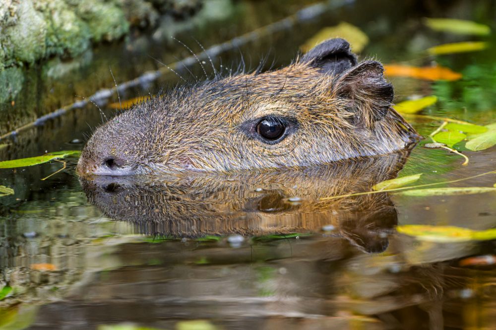 Foto 2: Kapybary tráví mnoho času ve vodě. Pod hladinou vydrží až deset minut a ve vodě se i páří. Není proto náhodou, že latinský, ale třeba i německý název zvířete zní v překladu „vodní prase“.