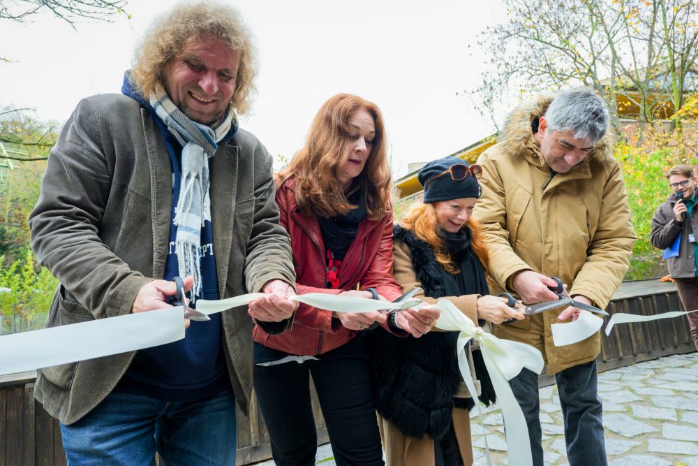Foto 3: Kapybary přivítali v Zoo Praha členové kapely Sto zvířat (zleva Míra Barabáš a Jana Jelínková), herečka Bára Štěpánová a ilustrátor Štěpán Mareš. Páska měla výjimečnou podobu dárkové stuhy, neboť je návrat kapybar do Zoo Praha především dárkem pro její návštěvníky.