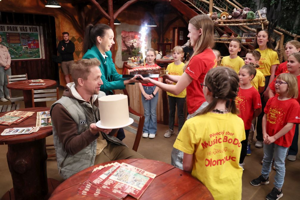 Michaela Tomešová a Tomáš Klus se sice nenarodili ve stejný den, ale krásně se sešli na place, a tak se pro ně přichystalo narozeninové překvapení – dva dorty, kytice, a především hudební vystoupení dětského sboru BoDo z Olomouce. Jakmile děti přišly na plac, Tomáš Klus s nimi začal zpívat a Míša Tomešová se dojala tak, že jí začaly téct slzy. „Já jsem myslela, že to je překvapení pro Tomáše, protože já mám narozeniny zítra. Ani mě to nenapadlo,“ neskrývala překvapení herečka, kterou čeká tajemná jízda. „Mám ráda narozeniny, překvapení a letos oslavím Kristova léta. Vždy si rezervujeme s manželem den a ten druhý ho překvapí. Nevím, co mě čeká a co Roman vymyslel, ale těším se. Jsem pro každou špatnost,“ usmívá se Tomešová. Z překvapení měl radost i Tomáš Klus, možná větší než děti, kterým svou přítomností splnil sen. „Měl jsem krásný narozeninový den, který mi připravila moje žena Tamara. Ráno mě odvezla na masáž. Pak jsem šel poprvé v životě na pedikúru, kdy jsem musel překonávat ostych. Od té doby ale, co se pedikérka Hanička dotkla mých nohou a začala dělat ty věci, tak jsem zjistil, že to budu chtít i dál. Potom jsme jeli na výborný oběd. Zajeli jsem ke kamarádce, kde jsme si spolu udělali šperk, vyrobili jsme si prstýnky. Bylo to zajímavý. A potom jsme jeli do sauny, ale když se otevřely dveře, byli tam všichni mí nejlepší přátelé. Myslím mužský kruh, bylo nás tam devět chlapů a bylo to fantastický,“ popisuje Klus, jak strávil svůj narozeninový den. Překvapení na natáčení tak bylo dalším hezkým dárkem. „Ráno jsem se probudil, šel sem a tady mi zpíval sbor dětí písničky – bylo to fantastický. Myslím, že děti taky byly rády, že mě vidí. Bylo to hezký, vzájemný a myslím, že by se věci měly právě tak dělat.“ A co Tomáš říká na přibývající věk? „To je mi jedno, nějak to neřeším. Spíš si vždycky říkám, že už jsem dospělý, a pak udělám něco a zjistím, že jsem pořád kluk,“ směje se.
