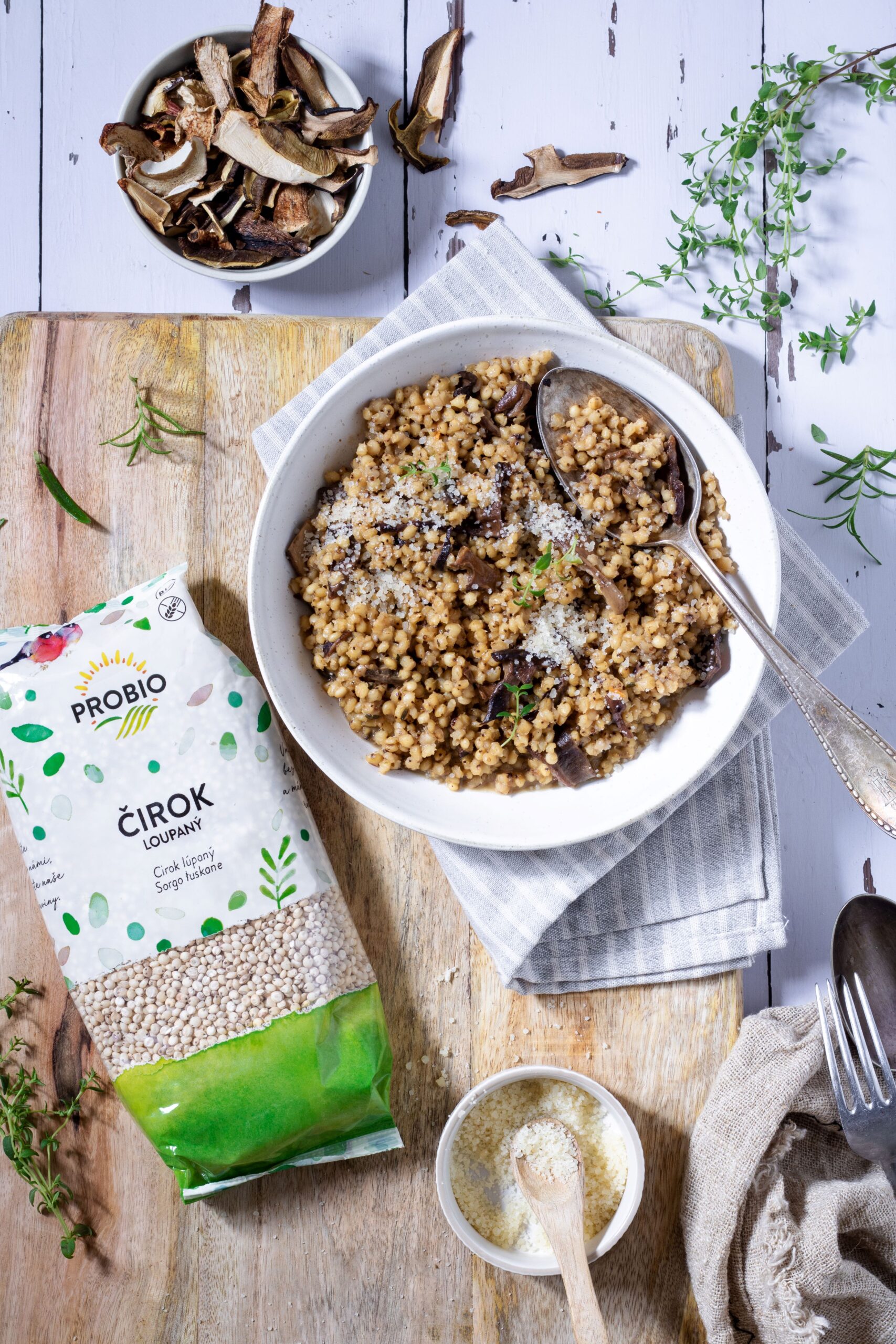 Čirok den předem namočte. Jednak se tím zkrátí doba varu a také tím zlepšíte jeho stravitelnost. Druhý den sceďte a v cedníku propláchněte čistou vodou. Houby zalijte asi hrnkem vroucí vody. V pánvi rozehřejte olej. Šalotku nakrájejte nadrobno a restujte dozlatova. Vsypte čirok a minutu až dvě míchejte. Podlijte vínem a míchejte, dokud se nevypaří. Pak vlijte houby i s nálevem a na středním plameni zase dál míchejte, dokud se tekutina nevypaří. Do pánve přidejte nakrájené bylinky a koření, osolte. Podlévejte postupně vývarem a za občasného míchání nechte vypařovat, dokud nebude čirok měkký. Když je čirok měkký, přilijte trochu vývaru, aby nebylo „rizoto“ suché. Přidejte do pánve nastrouhaný parmezán a máslo a míchejte, dokud se nerozplynou. Ihned servírujte. Podle potřeby posypejte parmezánem