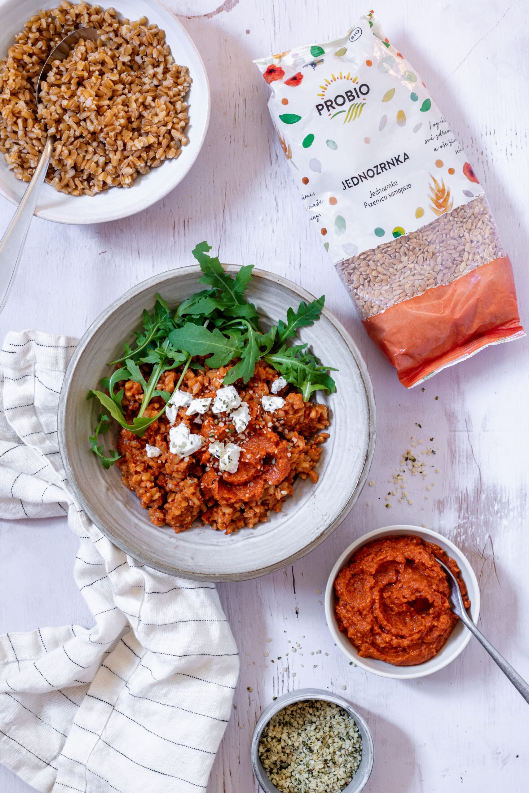 Po upečení opatrně přendejte papriky do mísy a zakryjte fólií. Nechte několik minut zapařit. Mezitím mandle opečte dozlatova na pánvi. Nasypte do food procesoru. Z teplých rajčat sloupněte slupku a vymačkejte šťávu. Pravděpodobně se vám bude nejlépe pracovat pomocí kleští. Stroužky česneku oloupejte. Rajčata i česnek přidejte do robota. Papriky přendejte na talíř a opatrně oloupejte. Uvnitř bude horká pára a tekutina. Papriku zbavte semínek a osušte papírovou utěrkou. Přidejte do food procesoru. Přidejte sušená rajčata, trochu olivového oleje, lžičku až dvě citronové šťávy, mletou papriku, sůl a pepř a mixujte dohladka. Podle chuti můžete přidat najemno nasekané bylinky. Omáčku promíchejte s uvařenou jednozrnkou. Naservírujte na talíře, posypejte rukolou a doplňte sýrem nebo rostlinnou alternativou.