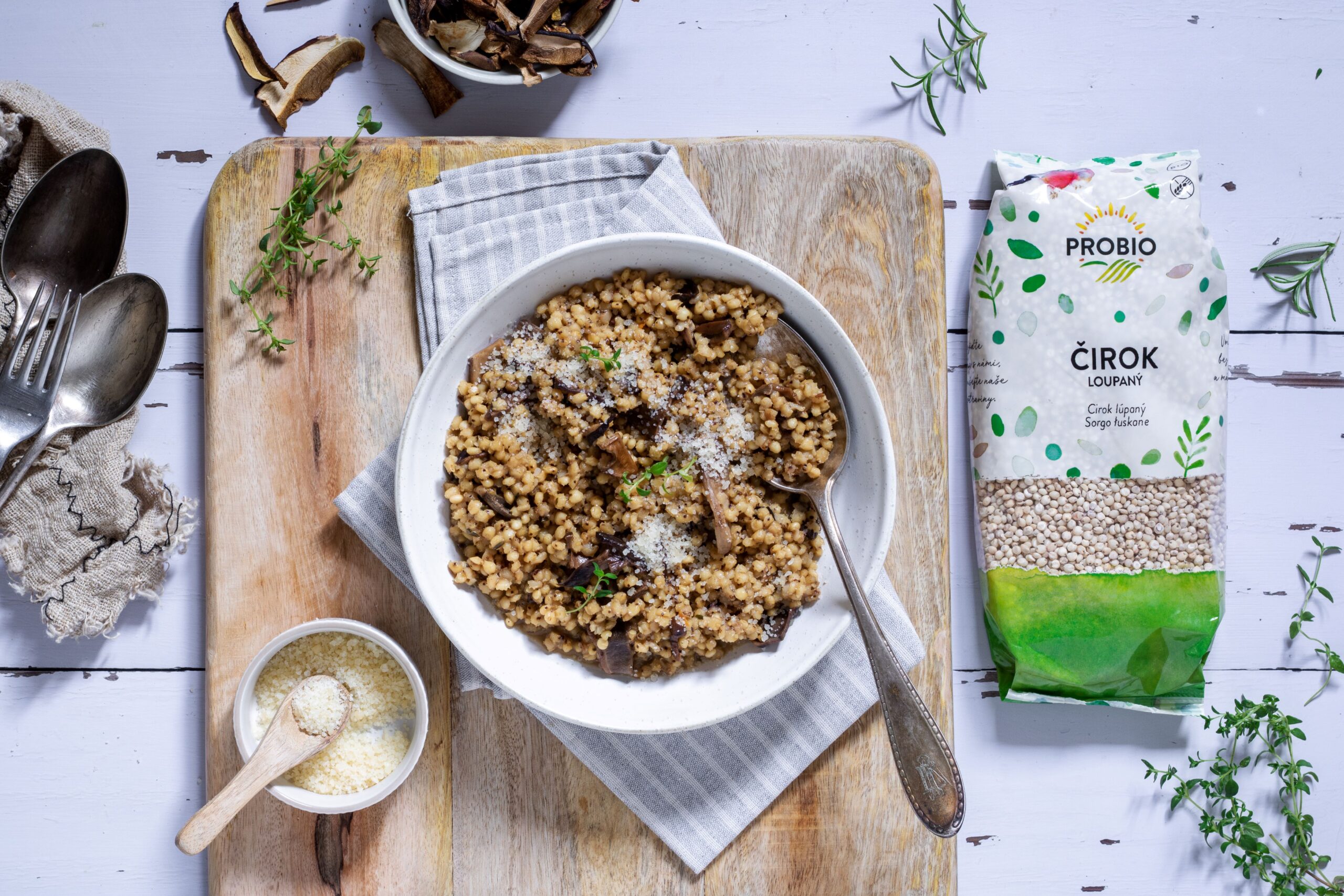 Čirok den předem namočte. Jednak se tím zkrátí doba varu a také tím zlepšíte jeho stravitelnost. Druhý den sceďte a v cedníku propláchněte čistou vodou. Houby zalijte asi hrnkem vroucí vody. V pánvi rozehřejte olej. Šalotku nakrájejte nadrobno a restujte dozlatova. Vsypte čirok a minutu až dvě míchejte. Podlijte vínem a míchejte, dokud se nevypaří. Pak vlijte houby i s nálevem a na středním plameni zase dál míchejte, dokud se tekutina nevypaří. Do pánve přidejte nakrájené bylinky a koření, osolte. Podlévejte postupně vývarem a za občasného míchání nechte vypařovat, dokud nebude čirok měkký. Když je čirok měkký, přilijte trochu vývaru, aby nebylo „rizoto“ suché. Přidejte do pánve nastrouhaný parmezán a máslo a míchejte, dokud se nerozplynou. Ihned servírujte. Podle potřeby posypejte parmezánem