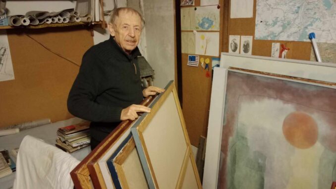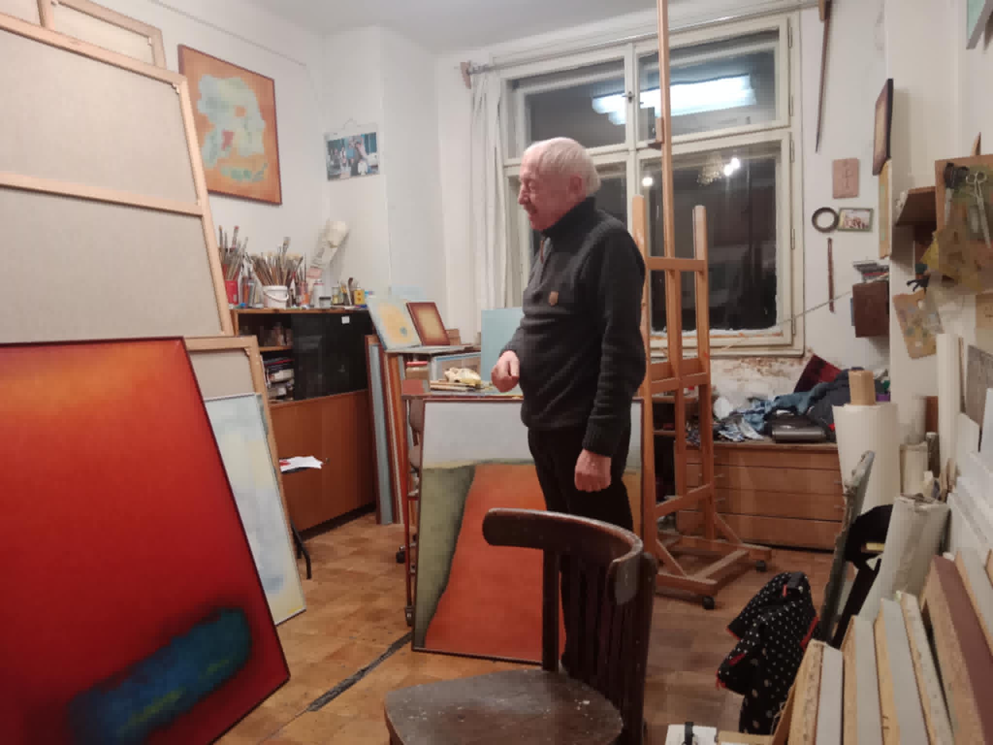 Na fotografii nahoře je malíř Štědra mezi svými obrazy v ateliéru v Lucemburské ulici v Praze.