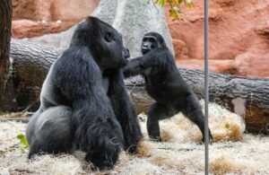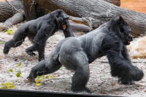 Foto 4: Šestiletý sameček Ajabu se rychle osmělil a bezmála dvousetkilového Kisuma po chvíli rošťácky provokoval. Foto Miroslav Bobek, Zoo Praha
