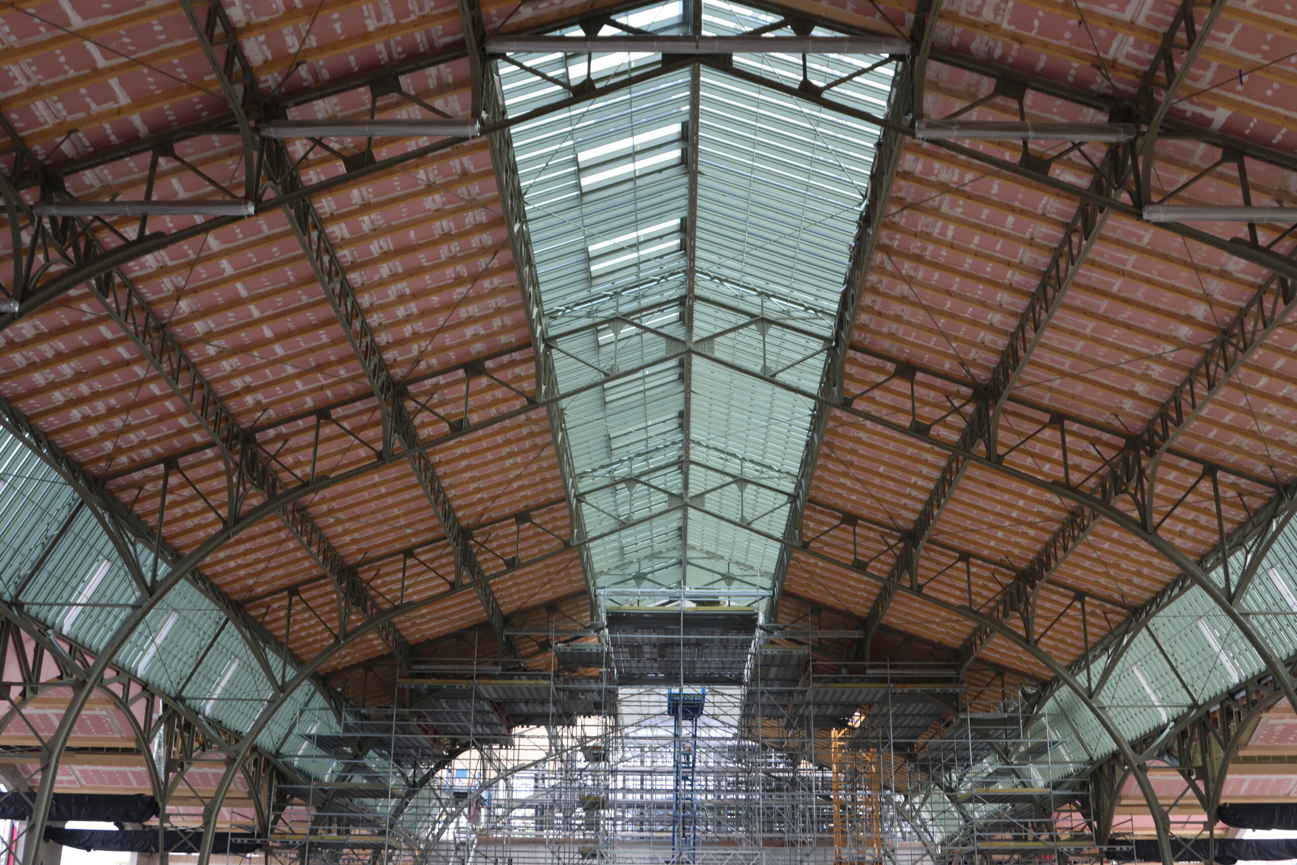 Práce značně pokročily i v interiérech střední haly. Zde je zrestaurovaná větší část ozdobných prvků. Kromě toho bylo opraveno na 550 kusů demontovaných ozdobných mříží a mřížek, osazeny jsou kopie původních hrotnic na zadním průčelí haly, vyrobeny jsou kopie kovářských prvků na střechy a zrestaurovány jsou rovněž původní lustry. Hotovo je nyní také 80 % střechy.