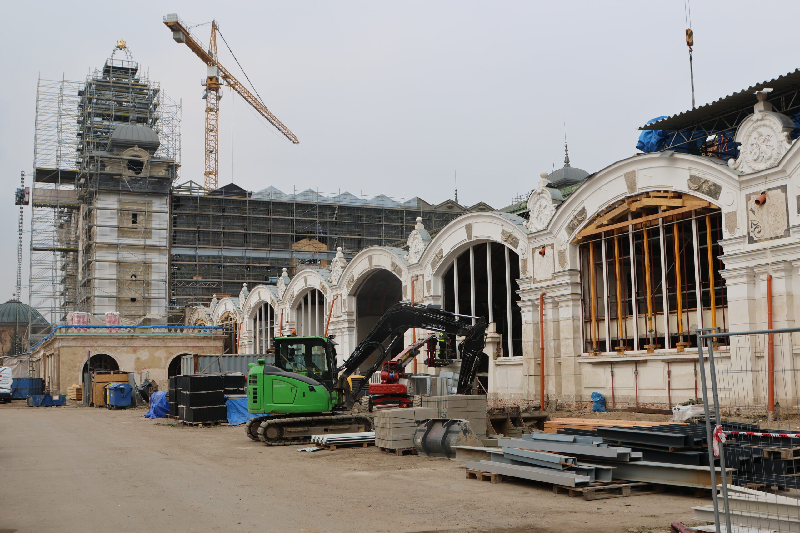Práce na kompletní rekonstrukci Průmyslového paláce na pražském Výstavišti jsou v procesu již tři roky. Vyhořelé levé křídlo dostalo nové obrysy a nyní se zakrývají ocelové konstrukce. Stavba má před sebou poslední rok a několik měsíců do úplné finalizace. S příchodem jara nabírají práce na stavbě opět na větší intenzitě. V současné chvíli pracovníci zasklívají kopule věže, instalují kovová opláštění a připravují i dubové podlahy. Nastěhován je hodinový stroj a v přípravě je také instalace hodinových ciferníků. K finálním pracím na věži dojde na konci jara. Hodiny pak začnou opět odbíjet s dokončením celé stavby, kdy předpokládaný termín předání stavby je červen 2026.