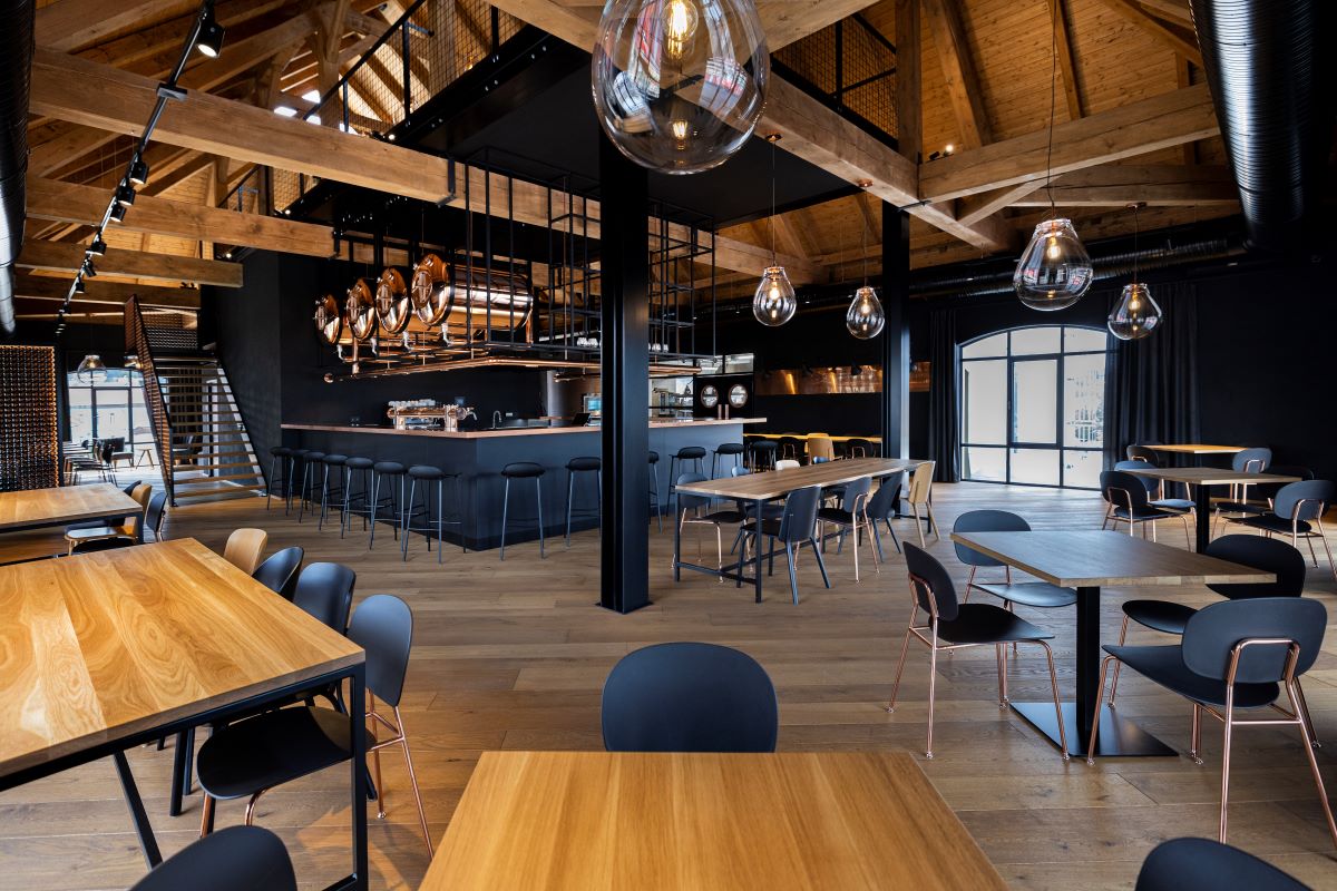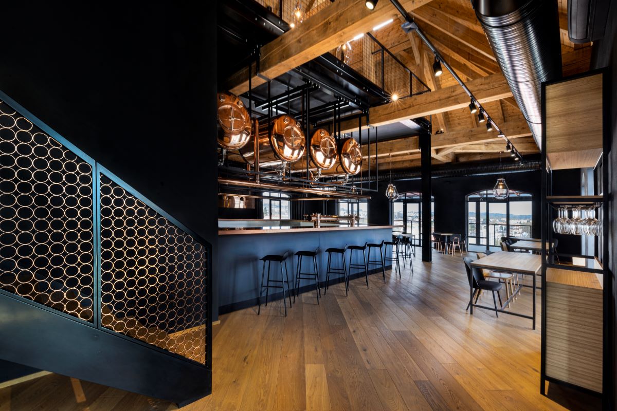 Architektonický skvost: Interiér, který získal řadu ocenění, citlivě propojuje historický odkaz pivovarnictví s vizí 21. století. Host u nás sedí přímo nad pivovarem, v centru dění.