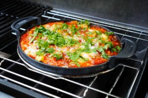 Do rozpáleného grilu na 220°c dáme rozehřát pánev. Pánev pokapeme olivovým olejem, přidáme na nudličky pokrájenou slaninu, červenou cibuli a červenou a žlutou papriku. Důkladně osolíme a opepříme. Vše společně orestujeme, přidáme vařené fazole, ajvar a na kostičky nakrájené avokádo zakápnuté limetou. V promíchané směsi vytvoříme důlky, do kterých vyklepneme vejce. Které osolíme a opepříme. Posypeme nastrouhaným sýrem a necháme zapéct. na konec přidáme nasekané bylinky (listová petržel, bazalka a koriandr). A můžeme podávat.