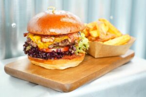 Z mletého hovězího masa si vytvarujeme 150ti gramové burgery, které poté grilujeme zhruba 2 min z každé strany. Těsně před koncem dáme na každé maso plátek cheddaru a plátek opečené slaniny.