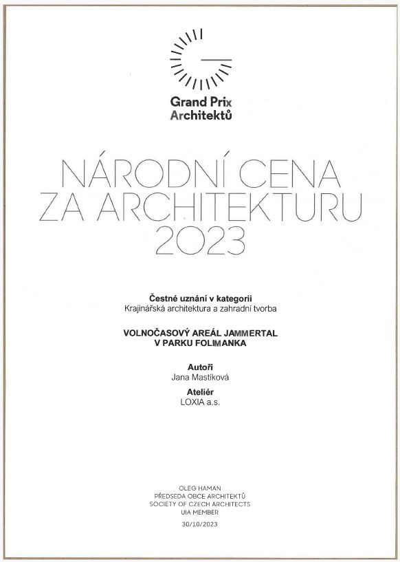 Praha (31. října 2023) Volnočasový areál, nacházející se v parku Folimanka přímo pod Nuselským mostem, uspěl v jedné z nejprestižnějších architektonických soutěží Grand Prix Architektů – Národní cena za architekturu 2023. Jammertal obstál v konkurenci 276 přihlášených projektů, dostal se do užší nominace nejlepších 50 tuzemských staveb, a získal nakonec čestné uznání v kategorii Krajinářská architektura a zahradní tvorba.