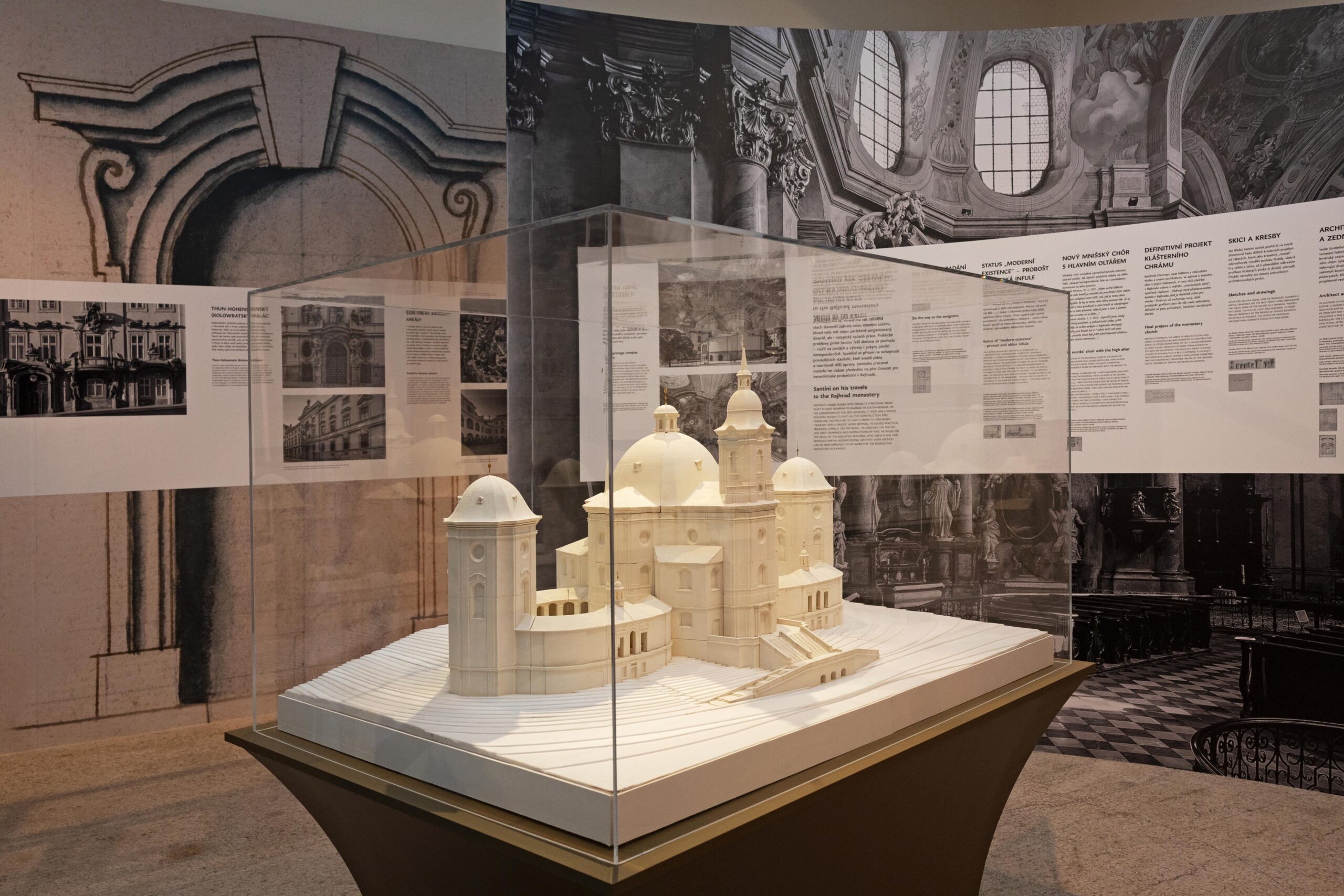 Kromě zápůjček řady exponátů z jiných kulturních institucí je výstava doplněna modely Santiniho staveb, které pro ni byly nově zhotoveny. Z originálních plánů budou v prvním období konání výstavy k vidění např. kresby vstupní fasády kostela sv. Jana Nepomuckého na Zelené hoře u Žďáru nad Sázavou z roku 1719, který zapůjčila Moravská galerie v Brně, a návrh boční fasády klášterního kostela v Kladrubech z období kolem roku 1711, který je uložen v benediktinském klášteře v Melku.