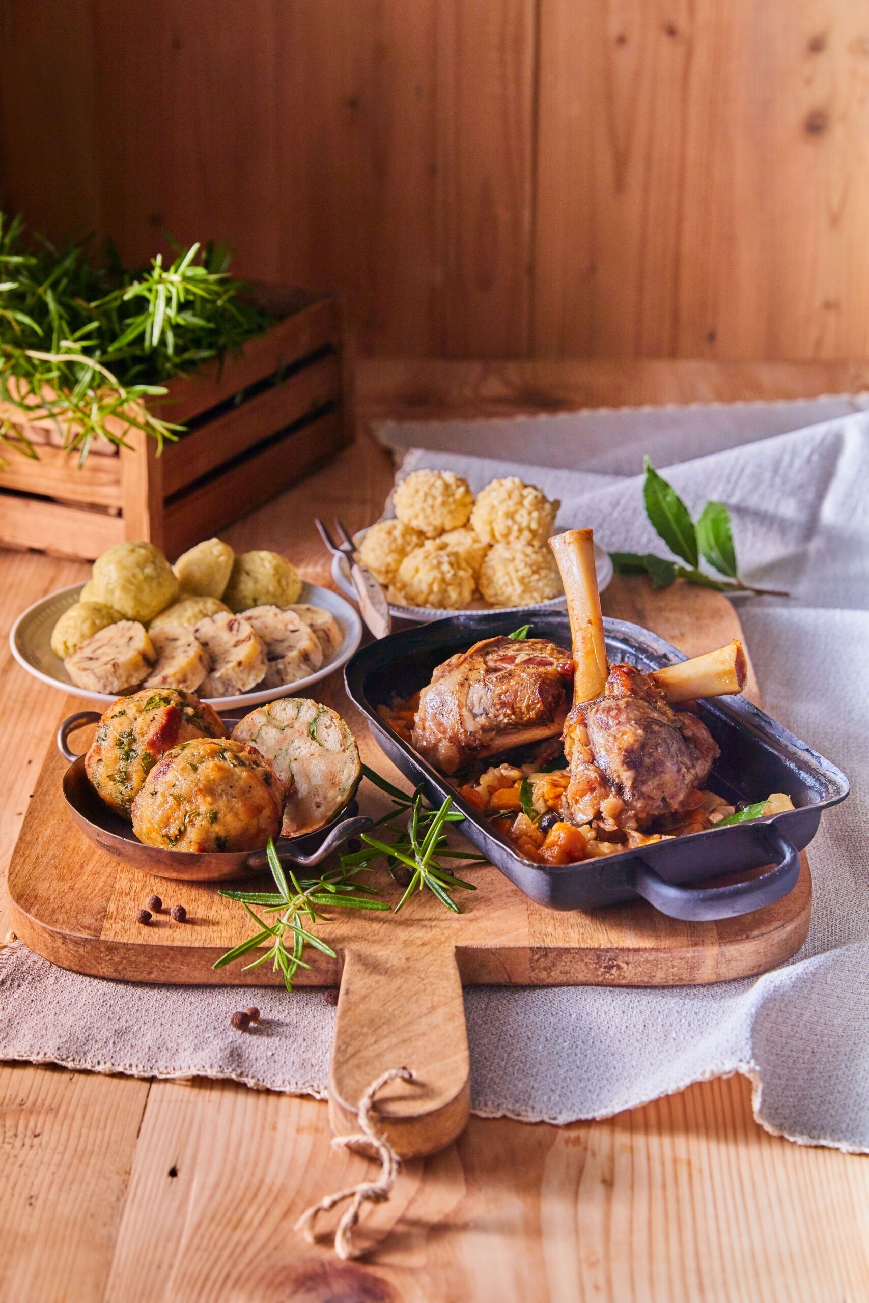 Na Velikonoční tabuli patří pokrmy z mladých mas – typicky jehněčího, kůzlečího nebo telecího. Co si tentokrát jehněčí připravit ještě lahodněji? Vyzkoušejte recept na pečené jehněčí kolínko s rozmarýnem servírované s pečeným knedlíkem Láznička.