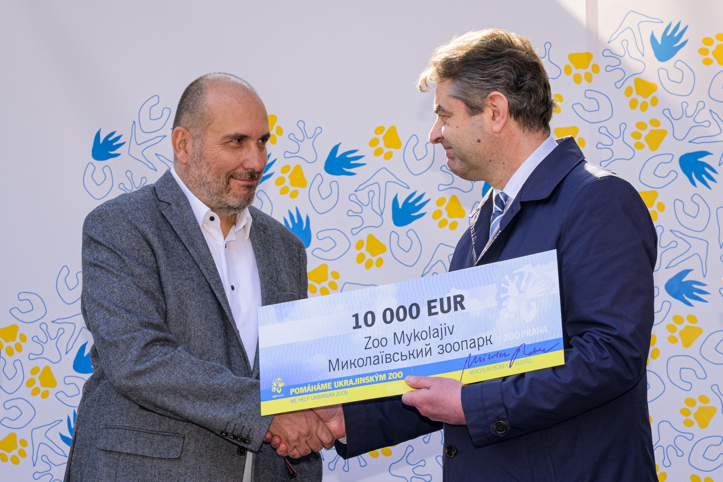 Toto úsilí ocenil ukrajinský velvyslanec v ČR Jevhen Perebyjnis, který si v rámci slavnostního zahájení převzal z rukou ředitele Miroslava Bobka symbolický šek ve výši 10 000 euro na pomoc právě mykolajivské zoo.