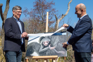 Foto 2: Jméno Claire dostal čtyřměsíční sameček gibona stříbrného. Jeho křtu se zúčastnili ředitel divize osobních vozů Volkswagen Patrik Fejtek a náměstek primátora hl. města Prahy Petr Hlubuček. Foto Khalil Baalbaki, Zoo Praha
