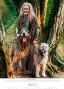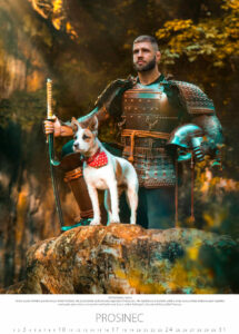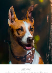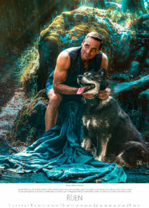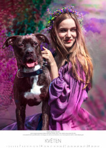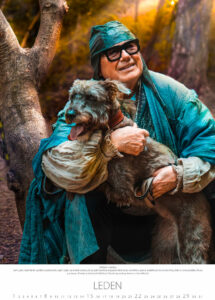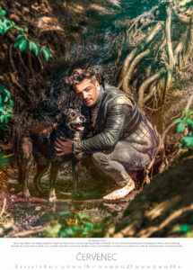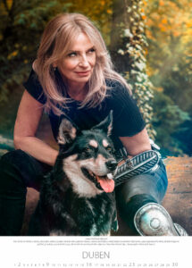 Zpěvák Jan Kopečný s Ájou. Ája s maminkou Jessi zažila peklo, když zůstala po smrti svého pána zavřená dva měsíce v chatce u řeky. Její máma se z toho už nevzpamatovala, a tak stará a nemocná Ája hledala nový domov sama. Našla skvělou rodinu, ale vydání kalendáře se bohužel nedožila.
