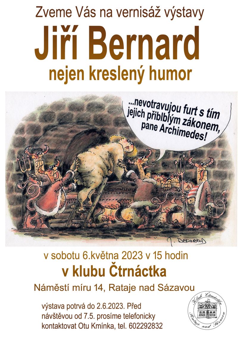 Za padesát let se bude v učebnicích psát: světoznámý malíř Jiří Bernard kreslil a vystavoval po celém tehdejším světě. Mimo jiné věhlasné metropole zejména v Ratajích nad Sázavou, zvaných Perlou posázaví. Ano. Tam v centru kulturního dění, v Klubu Čtrnáctka!