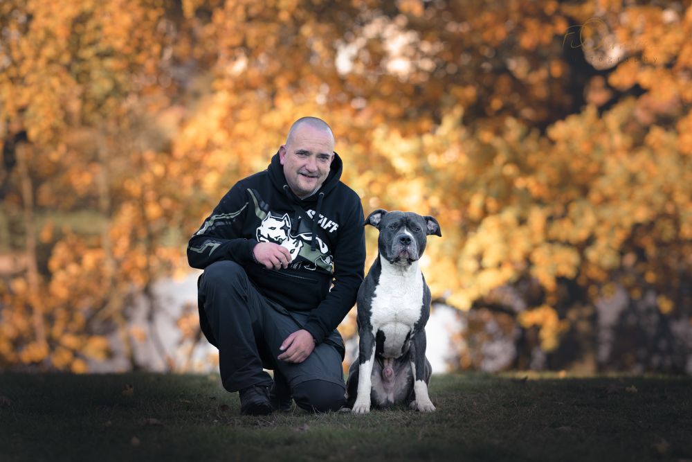 Původně to byl pes můj a mé přítelkyně, a při rozchodu jsme se dohodli, že zůstane mně. To mu byl asi rok. Já nikdy neměl psa, vždycky ho měly moje přítelkyně, nejdřív německý ovčák, potom zlatý retrívr, anglický buldok a nakonec Ari. Prvních 12 měsíců jsme chodili na všechny možné kurzy, pro štěňata, poslušnost, pokročilá poslušnost, obrany atd., ale nefungovalo to. Problém byl, že jsem Ariho nechtěl zlomit. Takže odpověď trenérů byla vždy stejná. Já nejsem dost důsledný, a co se divím, když mám staforda. Až ve škole, konkrétně v akademii ATA pana Ščučky, jsem se nakonec dozvěděl, že zásadní je něco úplně jiného. Právo toho psa, nebo jiného zvířete, snažit se, učit se s radostí a uspět. A být pak i odměněn.