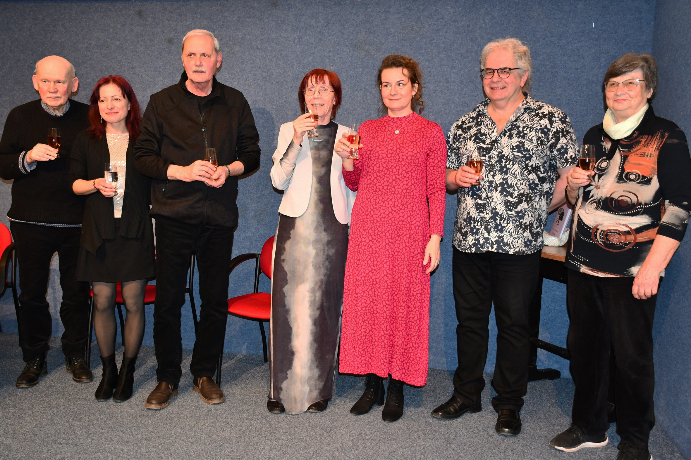 Zleva: Vladimír Novotný, Eva Voříšková, Jiří Poslední (ilustrátor knihy Prapříběhy), Eva Válková, Gabriela Špalková, Miloslav Krist (Vydavatel) a Dagmar Svatková (kmotra křtěných knih).