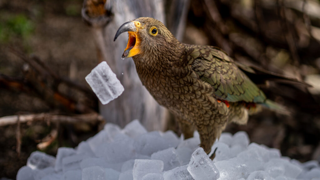 Foto 2: Čtyřčlenná skupina nestorů kea si s ledovým enrichmentem vyhrála ze všech zvířat nejvíc. Zejména dvě letošní mláďata těchto chladnomilných papoušků kostky olizovala a poté se bavila jejich vyhazováním do vzduchu. Foto Tereza Šolcová, Zoo Praha