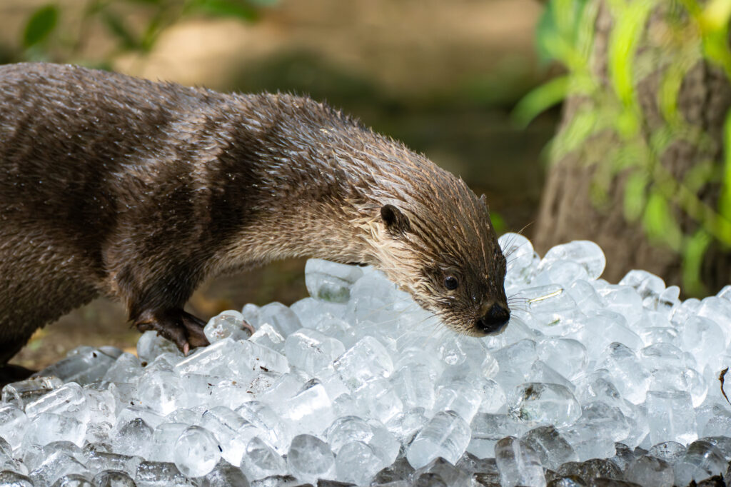 Foto 3: Pár vyder severoamerických pohlížel nejprve na kostky ledu poněkud bázlivě. Po krátké chvíli však zvědavost v kombinaci s chutí na poblíž položené ryby zvítězila a i jim led poskytl v horkém dni ochlazení. Foto Oliver Le Que, Zoo Praha