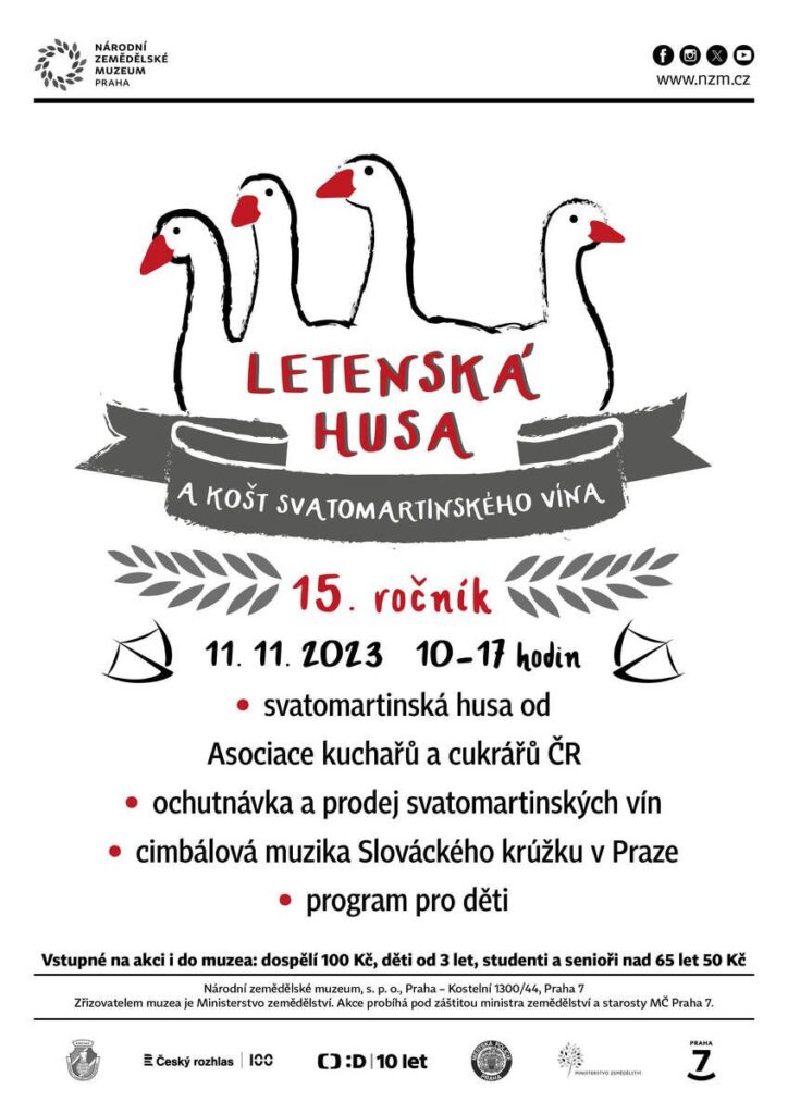 Národní zemědělské muzeum v Praze na Letné připravilo už patnáctý ročník akce Letenská husa. Návštěvníky čekají svatomartinská husa i vína, cimbálová muzika, výroba mašlovaček z husího peří, moštování a zejména starokladrubští koně ve službách Městské policie Praha. Akce se koná v sobotu 11. listopadu od 10 do 17 hodin.