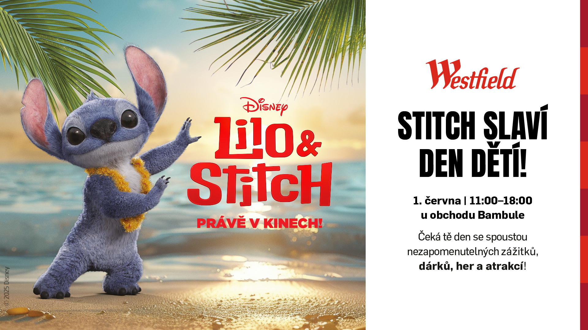 Obchodní centrum Westfield Chodov se na celé léto promění v tropický ráj pro děti. Od 1. června do 31. července zde na malé návštěvníky čeká herní zóna na motivy oblíbeného animovaného filmu Lilo & Stitch, kterou připravilo centrum ve spolupráci se společností Disney. Slavnostní otevření proběhne už tuto neděli 1. června, tedy na Den dětí – děti se mohou těšit na speciální program plný soutěží, vlastnoručně vyrobených dárků i beach party s DJem. Zóna bude otevřena přímo u prodejny Bambule každý den a každý týden od čtvrtka do neděle nabídne od 13.00 do 18.00 program plný zábavy, tvoření, tance a objevování. První den bude opravdu výjimečný – od 11.00 do 18.00 se odehraje celodenní program v havajském stylu. Děti si vyrobí květinové věnce nebo uši jako má Stitch, zatančí si na workshopu a vyzkouší tematické edukační hry jako anglické bingo nebo třídění odpadu zábavnou formou. Chybět nebude ani beach party s DJem, tanečnicí a hudbou z filmu. „Chtěli jsme dětem nabídnout letní program plný pohybu, tvoření a zábavných aktivit, které je i něco naučí. Díky spolupráci s Disney se nám podařilo vytvořit prostředí, které děti vtáhne přímo do příběhu Lilo a Stitche – příběhu, který i v novém zpracování krásně připomíná, jak důležité je přátelství, sounáležitost a rodina,“ říká Marta Barbara Keszczyk, marketingová manažerka Westfield Chodov.
