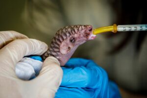 Foto 1: Samička luskouna krátkoocasého díky dokrmování přibývá na váze každým dnem. Foto Miroslav Bobek, Zoo Praha
