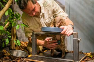 Foto 2: Ultrazvukové vyšetření potvrdilo březost luskouní samice Run Hou Tang v Zoo Praha. Její mládě se stane prvním mládětem luskouna v Evropě. Foto Roman Vodička, Zoo Praha
