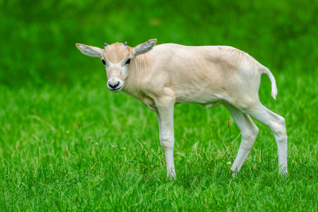 Foto 2: Mladšímu ze dvou mláďat adaxů jsou teprve dva týdny. Návštěvníci ho od jeho dvouměsíční sestry poznají podle menšího vzrůstu i kratších rohů, které budou mít v dospělosti spirálovitý tvar. Foto Petr Hamerník, Zoo Praha