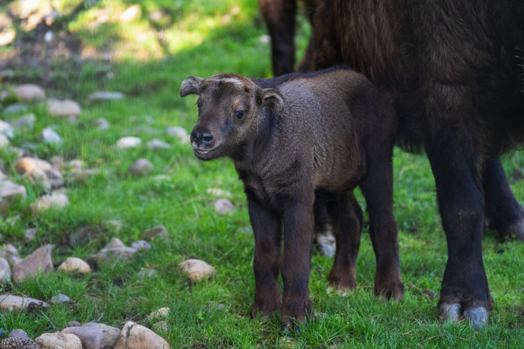 Foto 4: Narození malého takina indického bylo pro chovatele překvapující. Samice totiž zabředla nečekaně pozdě. Týdenní sameček však prosperuje a už zvídavě prozkoumává výběh v horní části zoo. Foto Oliver Le Que, Zoo Praha