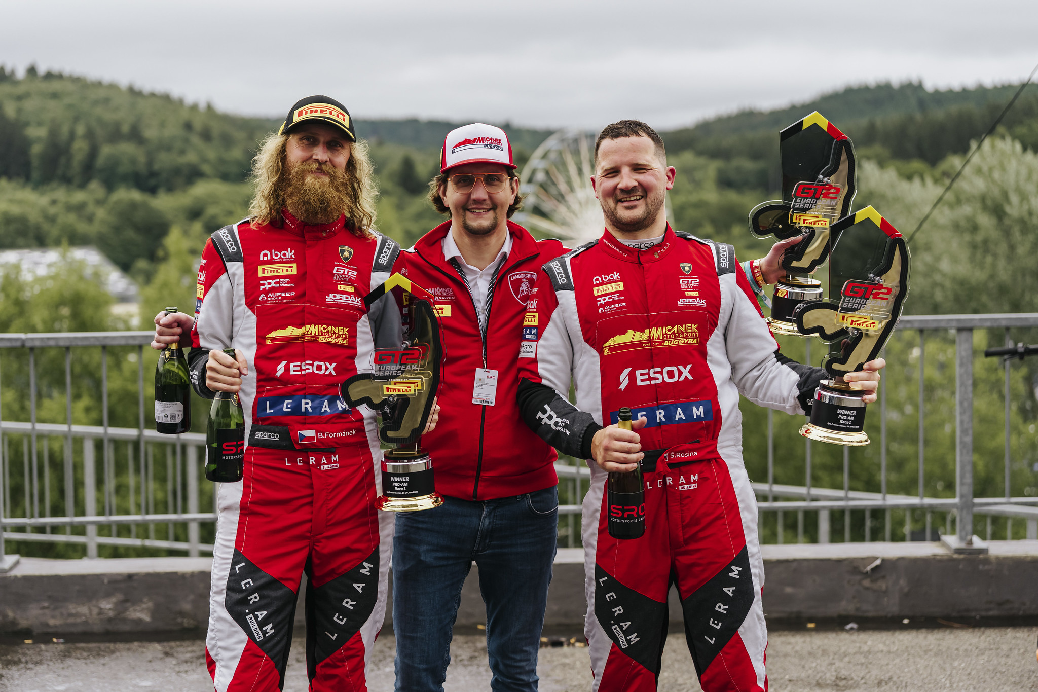 Z komfortního náskoku najednou bylo pár vteřin, rozdíl mezi Lamborghini Huracán ST EVO2 týmu Jiřího Mičánka a soupeři nesměl v cíli přesáhnout právě 13 vteřin. Ve druhém stintu zároveň začal trať ve Spa skrápět drobný déšť, který výrazně ztížil podmínky na trati. Rosina postupně ztrácel klíčový náskok, v posledních kolech ale začala trať osychat a zkušený slovenský pilot předvedl neuvěřitelný výkon „proti stopkám“ – v posledním kole zajel nejrychlejší kolo celého závodního víkendu napříč celým startovním polem a v cíli komfortně udržel klíčový náskok na LP Racing. Ve druhém závodu potrestalo race direction Štefana Rosinu za to, že nedodržel formaci těsně před startem. Pětisekundovou penalizaci připočetlo k délce pit stop. Ten už i tak měl tým o 10 vteřin delší – podle pravidel takové znevýhodnění získává vítěz předchozího závodu. „Snažil jsem se penalizaci dojet a povedlo se, odevzdával jsem auto s šestivteřinovým náskokem na druhého. Kvůli penalizaci za vítězství jsme ale vyjeli zpět na trať až třetí,“ vysvětluje Rosina. Formánek tak měl před sebou Roberta Pampaniniho i Davita Kajaiu na KTM s náskokem víc jak 5 vteřin. „Byl jsem nervózní, moc jsem nevěřil, jestli se můžeme dostat zpět do vedení. Broňo ale předvedl heroický výkon, určitě nejlepší z celého víkendu. Myslím, že překvapil nejen mě, ale celý paddock,“ říká Rosina.