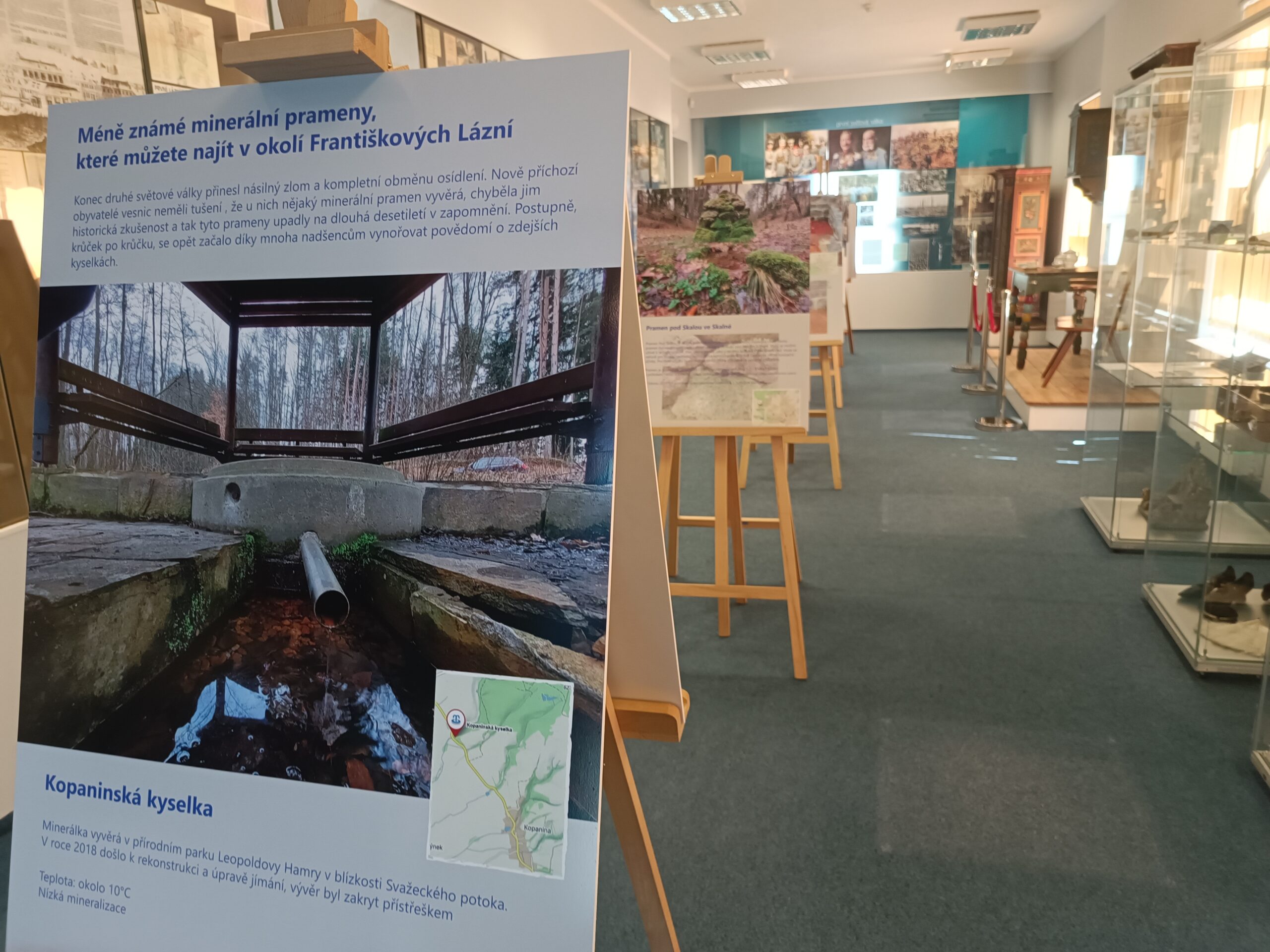 Voda, která léčí byl název další výstavy v Muzeu. Na Františkolázeňsku je celá řada méně známých pramenů a mnoho z nich zcela zmizelo nejen postupem vegetace, některé i pod nánosem odpadků. Výstavu připravila muzejní pedagožka Kateřina Doubravová spolu s kastelánem hradu Ostroh (Seeberg)Janem Buriánkem. Součástí výstavy byly také historické lázeňské pohárky, pítka a lahve na minerální vodu. Expozice historických skleněných lázeňských pohárků obsahovala pohárky z křišťálového skla ozdobené gravírováním nebo barvené zlatým rubínem. Námětem pohárku nejčastěji bývaly charakteristické lázeňské motivy. Minerální voda má zpravidla obsah rozpuštěných pevných látek vyšší než 1 g/litr nebo obsah volného oxidu uhličitého vyšší než 1 g/litr. Aby se mohla minerální voda využívat lázeňsky a léčebně musí mít konkrétní pramen osvědčení Ministerstva zdravotnictví jako přírodní léčivý zdroj. Ve Františkových Lázních je 22 léčivých pramenů. Dalším přírodním zdrojem je oxid uhličitý ze zdroje Marie. Kolem vývěru byly v centru postaveny uhličité plynové lázně. K léčbě se rovněž používá slatina z okolních ložisek. Po procedurách se použitá slatina vrací na speciální úložiště k několikaleté regeneraci. V roce 1957 prováděl Zeměvrtný podnik v okolí Františkových Lázní vrty za účelem vymezení ochranného území pro léčivé zdroje pro případ těžby uhlí. U Nové Vsi se navrtal podnik 16. října pravděpodobně podzemní proud zásobující léčivé prameny. Voda vytryskla do výše 40 m při množství 700 l/min. Vydatnost léčivých pramenů prudce poklesla, např.: Kostelní pramen s dřívější vydatností 160-210 l/min dával pouze 3 l/min. Dne 20. října byl vrt uzavřen ventilem a betonovými deskami. Kapacita pramenů se postupně navyšovala a na jaře 1958 nastal původní stav.