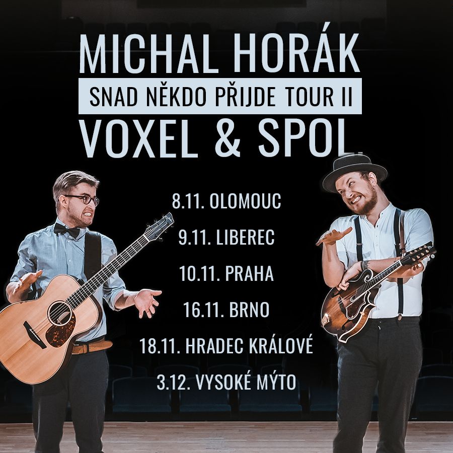 Ač už je to nějaký ten pátek, co nás Michal Horák naposledy oblažil novým klipem, který – jak je u něj zvykem – válcoval internety, mladý písničkář ani tak nemá stání. Držitel ocenění Objev roku v anketě Český slavík během posledních měsíců projel republiku křížem krážem, v sobotu 15. 10. vystoupil s na míru napsanou písní Rande naslepo společně s nevidomým zpěvákem Benjaminem Levíčkem na benefičním koncertu pro Světlušku, a právě v těchto dnech se chystá na speciální koncertní šňůru s žánrově i lidsky spřízněným písničkářem Voxelem. Pánové ji s nadhledem sobě vlastním pojmenovali Snad někdo přijde Tour a navštíví během ní mezi 8. listopadem a 3. prosincem šest měst.